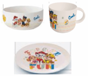 PLU 620733 keramikas krūze230 ml. lic. Paw Patrol KIDS PLU 620734 keramikas bļoda540 ml. lic. Paw Patrol KIDS PLU 620736 keramikas šķīvis19cm lic. Paw Patrol KIDS