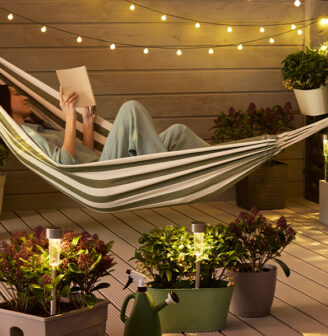 - Apgaismojums – pakariniet koku zaros vai krūmos mājas priekšā LED gaismekļus siltos toņos. Celiņa abās pusēs iespējams izkārtot arī laternas ar saules bateriju.