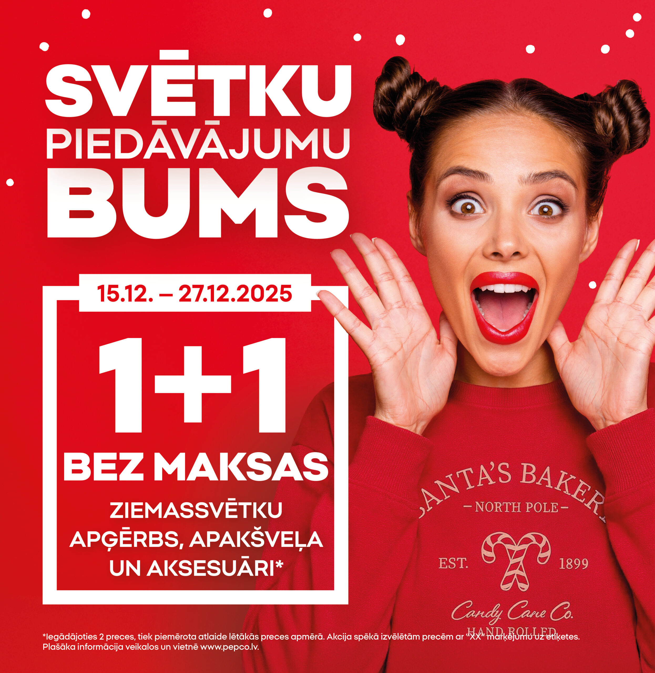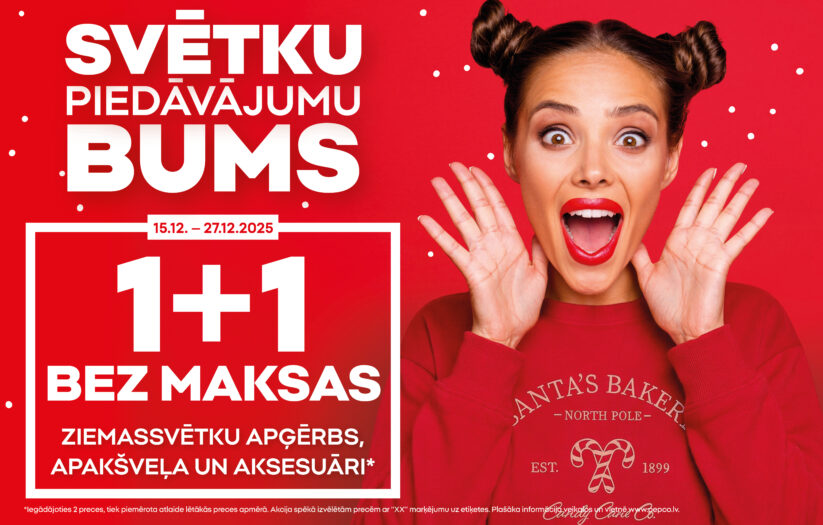 1+1 BEZ MAKSAS! Ziemassvētku apģērbs, apakšveļa un aksesuāri / Piedāvājums attiecas uz izvēlētām precēm un ir spēkā no 15. līdz 27.12.2025 / Apskati noteikumus un nosacījumus