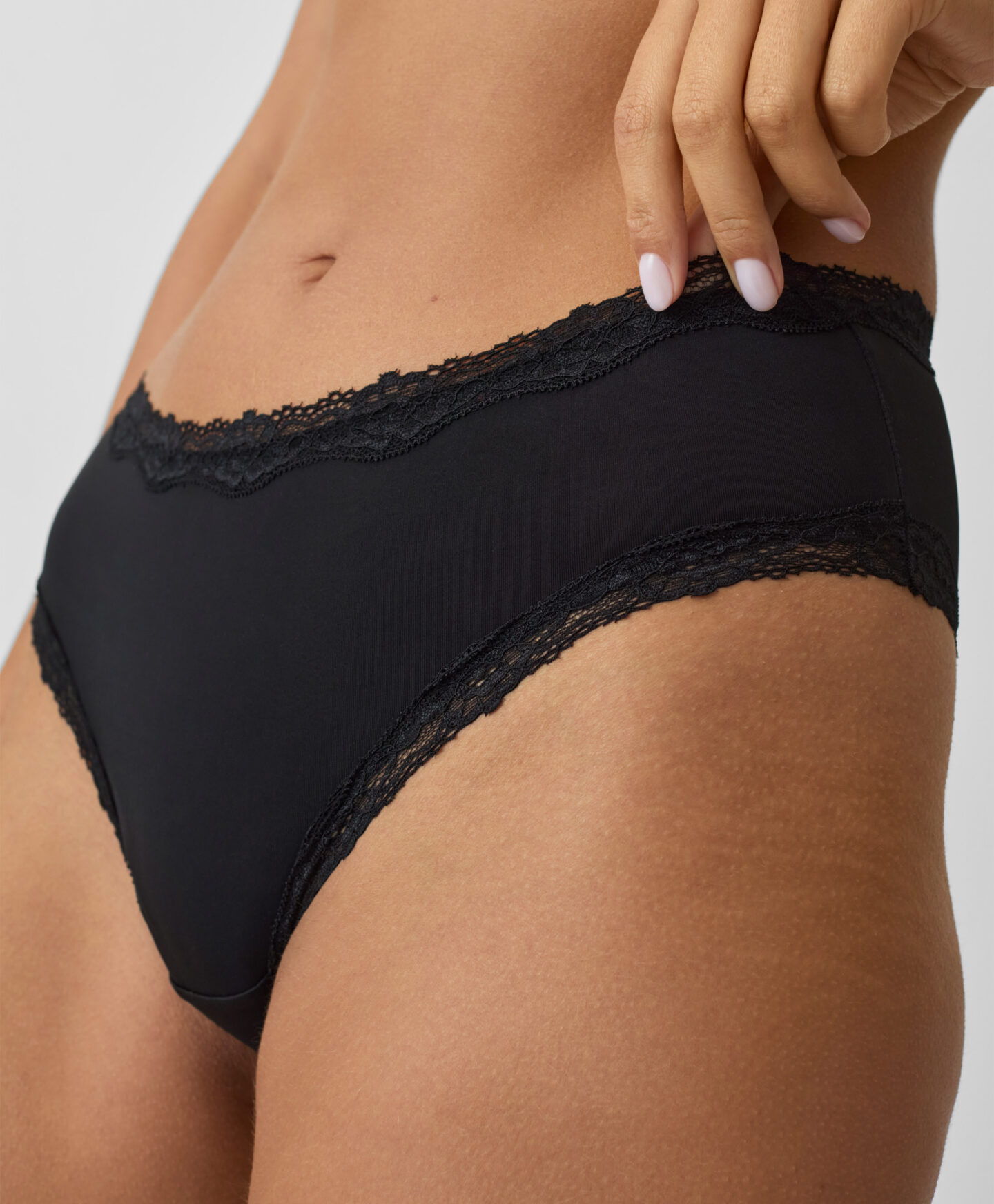 Apakšbikses ar kokvilnas ielaidumu ir ērta izvēle ikdienai. Eleganti melnais tonis un mežģīņotā apdare piešķir izsmalcinātību. Apakšbikses skaisti pieguļ figūrai, izceļot tās priekšrocības. Biksītes nerēgojas zem apģērba, nodrošinot pārliecību un diskrētumu.