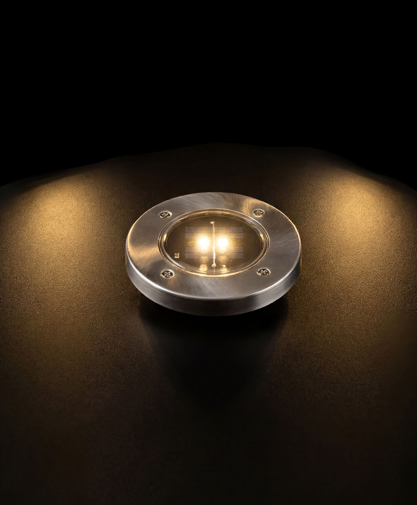 3 apaļu lampu komplekts zemei ar saules bateriju ir ātrs un lēts risinājums īpašuma apgaismošanai. Tās ir paredzētas ievietošanai tieši zemē, ir minimālistiskā stilā veidotas un ļoti estētiskas. Šādas lampas ir ideāli piemērotas celiņu, puķu dobju, mājas ieejas vai terases apgaismošanai. Katra lampa automātiski ieslēdzas krēslas iestāšanās brīdī un izslēdzas rītausmā, nodrošinot vienmērīgu apgaismojumu visas nakts garumā. Izgatavotas no kvalitatīviem materiāliem, lampas ir izturīgas pret lietu, sniegu, sauli un UV starojumu.