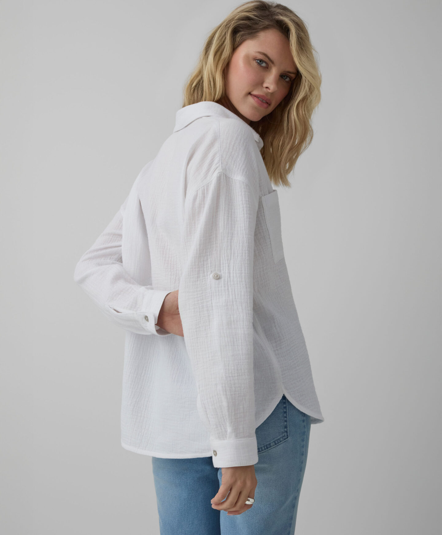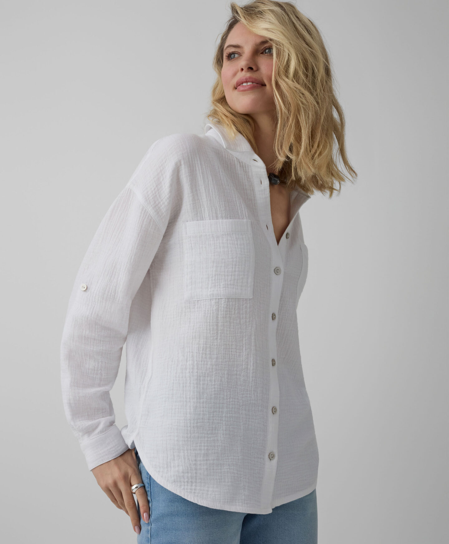 100% kokvilnas baltais krekls ir piedāvājums ikvienam, kas meklē dabiskus materiālus un izsmalcinātu stilu. Muslīns sniedz neparastu maigumu, vieglumu un ļauj ādai elpot. Universālā, baltā krāsa ir sinonīms vienmēr aktuālam dizainam, turklāt skaisti sader ar jebkuru garderobes elementu, sākot no biksēm līdz svārkiem.