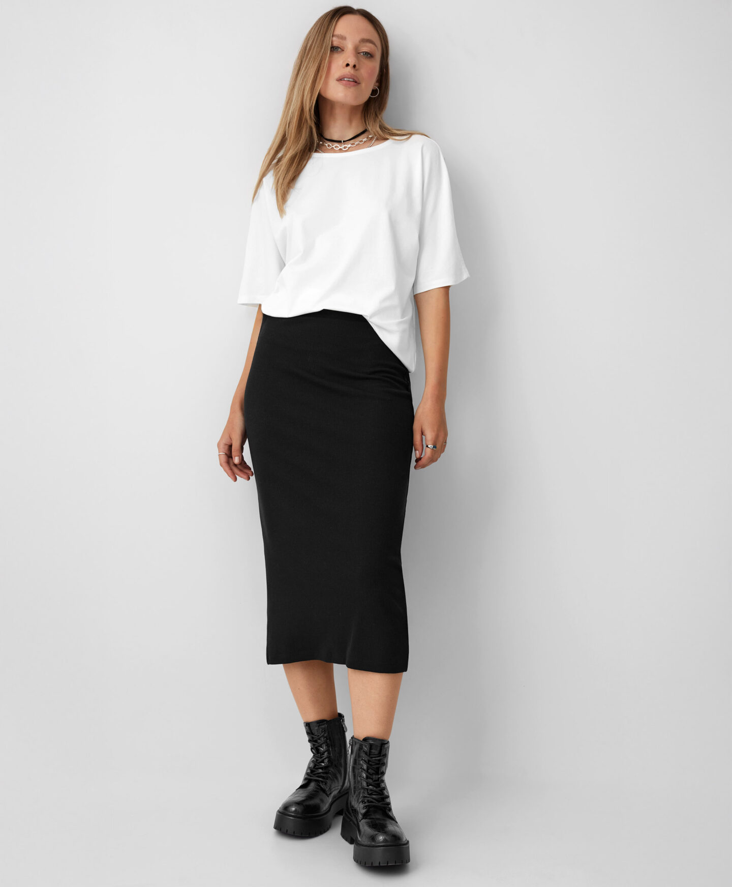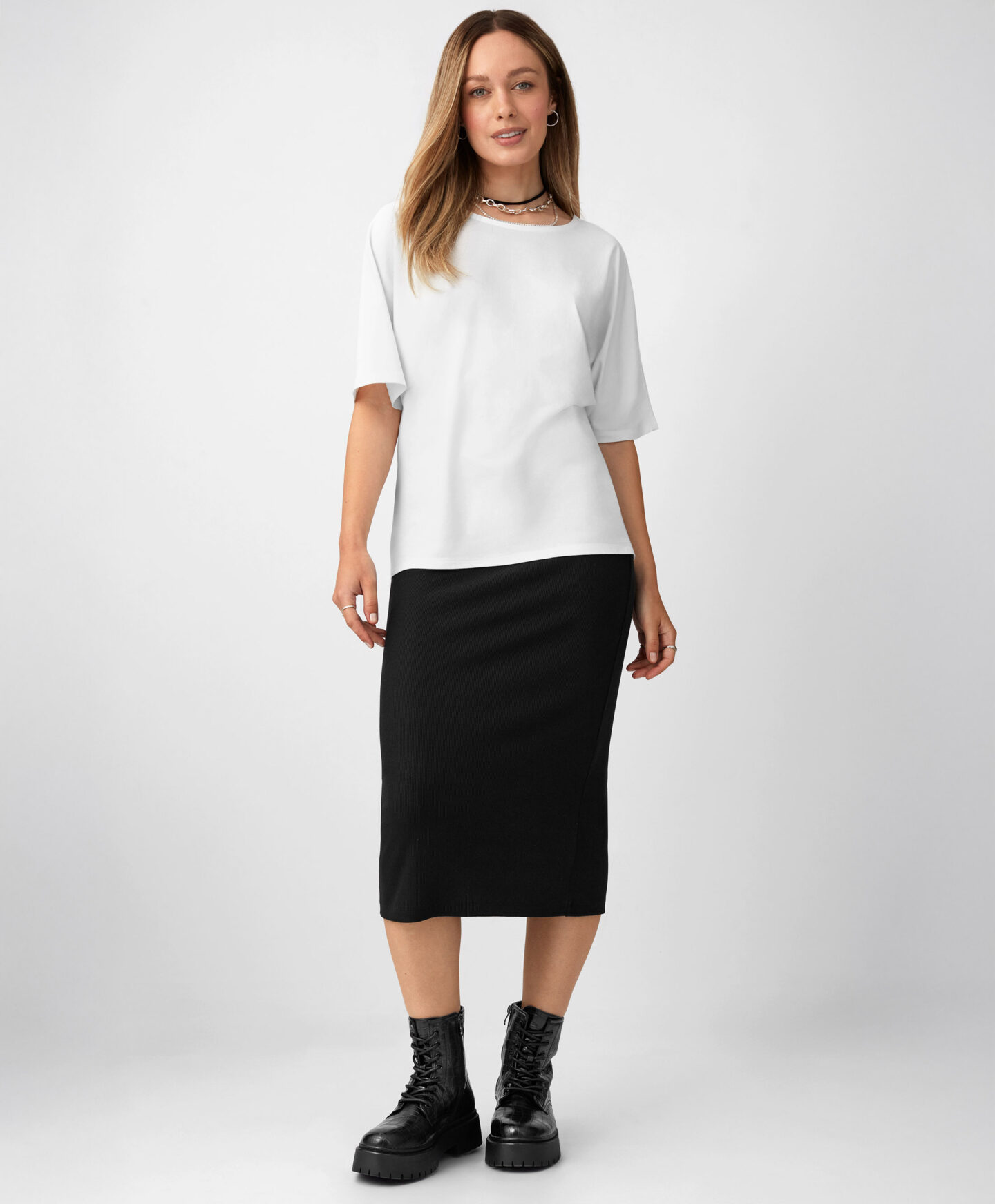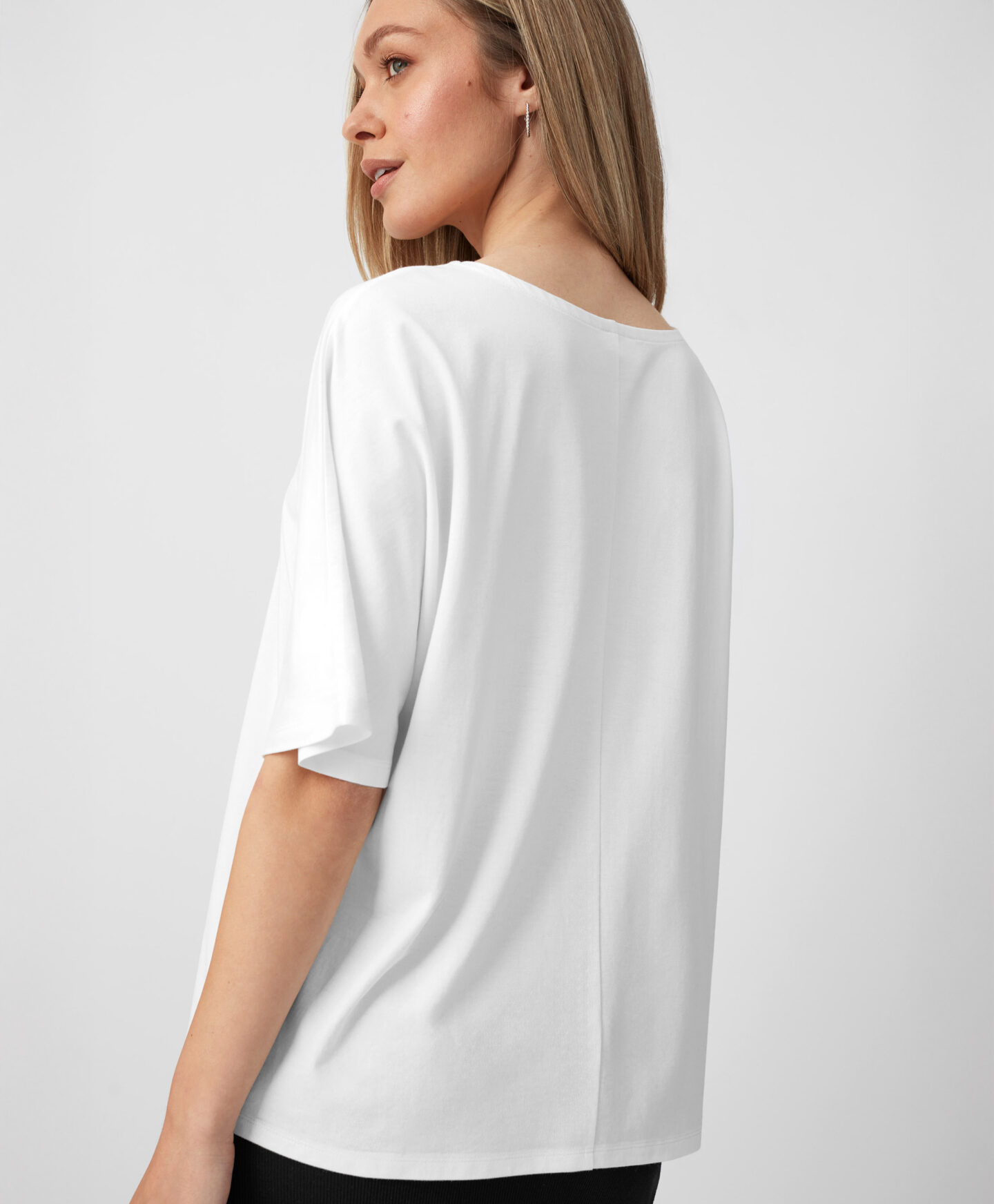 Balts T-krekls ar savilkumu ir klasisks un stilīgs risinājums. Pateicoties elegantajam piegriezumam un savilkumam sānos, krekliņš lieliski izceļ augumu. Ideāli piemērots dažādiem notikumiem – gan ikdienas izbraucieniem, gan vakara tikšanās reizēm. Piedāvājumā ietilpst divi krāsu varianti.