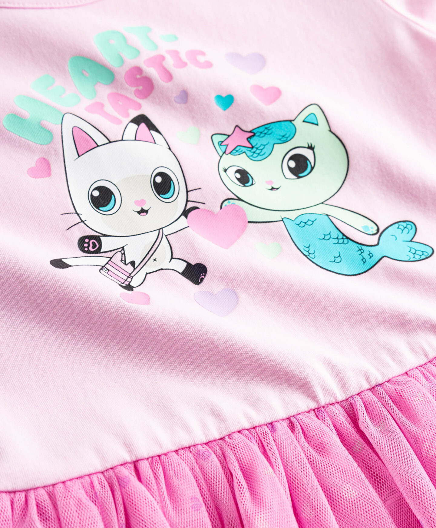 Bērnu kleitai GABIJAS LEĻĻU MĀJA ir tilla apakšdaļa, kas piešķir tai vieglumu un pasakainu noskaņu. Priekšpusē redzamā apdruka ar iecienītākajiem multfilmu varoņiem piesaista skatienu un izceļ kleitu starp citiem apģērba elementiem. Šī ir gatava stila ideja bērnudārzam vai ģimenes svinībām.