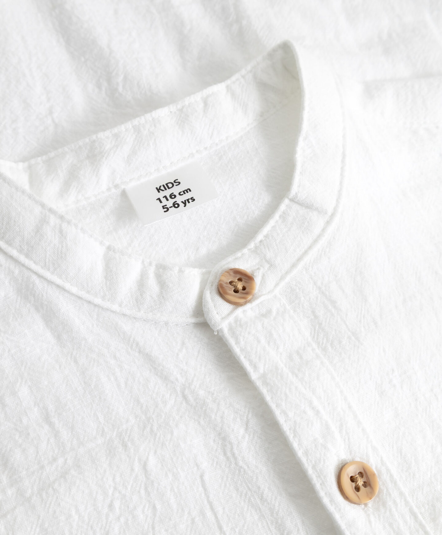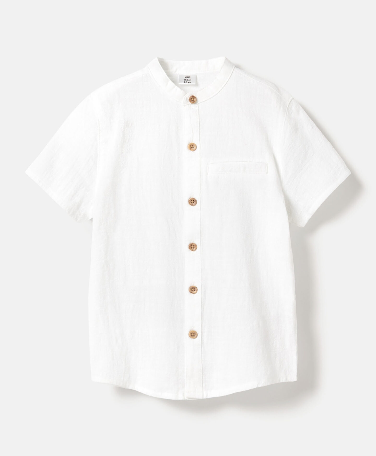 Šis baltais bērnu krekls ir ideāli piemērots ģimenes pasākumiem. Tā 100% kokvilnas sastāvs garantē gaisa caurlaidību un komfortu. Kontrastējošās, brūnās pogas un mini stāvveida apkakle piešķir kreklam formālāku un modernāku izskatu. Īsās piedurknes ir ideālas siltākās dienās. Krekla universālā krāsa ļauj to kombinēt ar jebkuras krāsas biksēm.