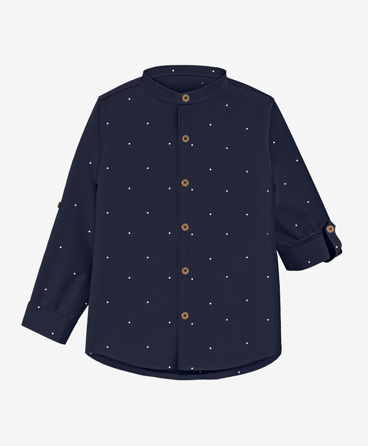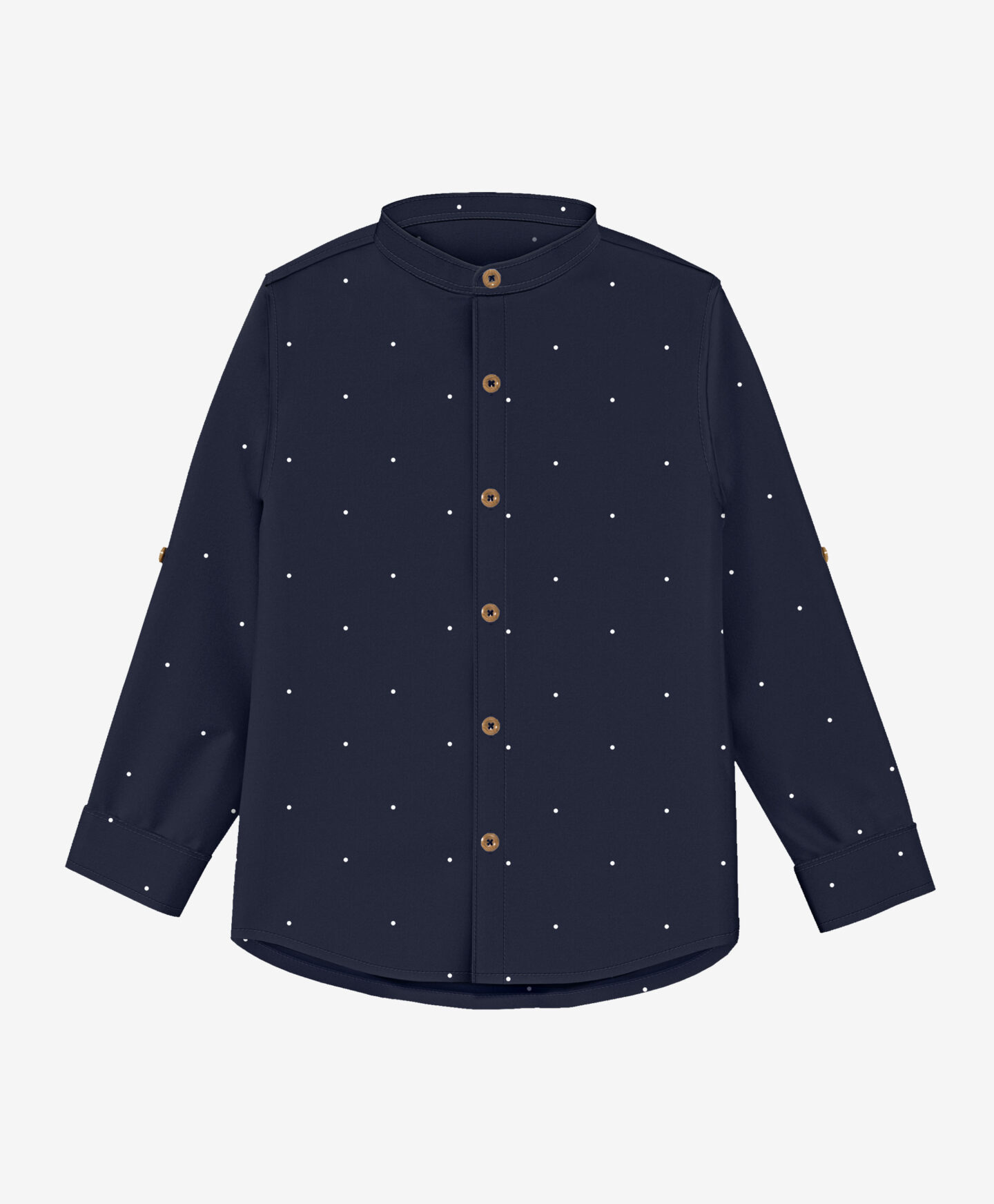 Bērnu krekls ar punktiņiem ir piemērots formālām reizēm. Nelielā stāvveida apkakle piešķir raksturu un stilu. Garās piedurknes var uzlocīt un piestiprināt ar pogu. Klasiskā, tumši zilā krekla krāsa papildinās gan gaišas, gan tumšas bikses.