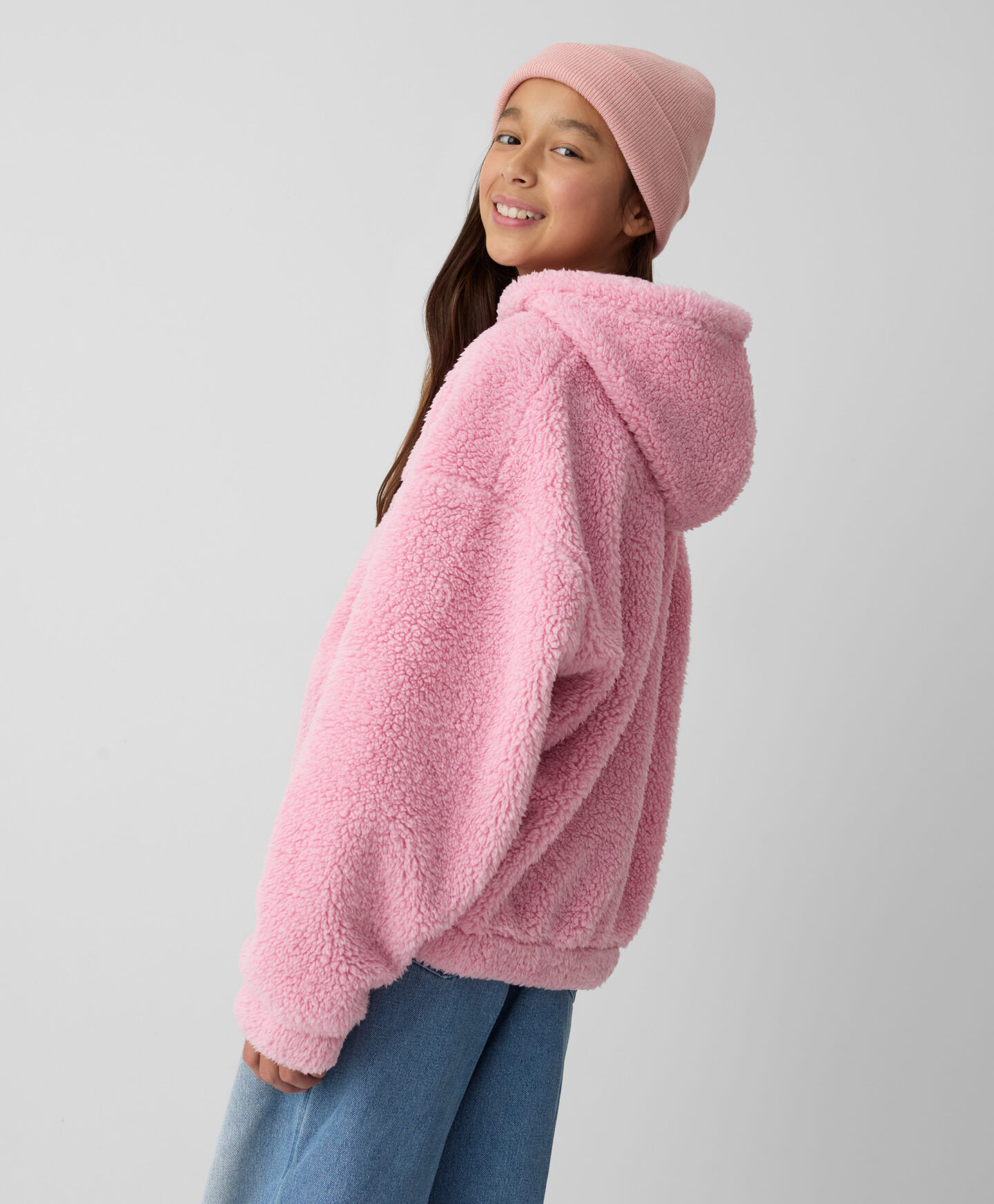Bērnu rozā flīsa džemperis ar kapuci ir siltuma un komforta apvienojums. Tas ir izgatavots no mīksta materiāla, kas nodrošina bērnam pilnīgu komfortu. Kapuce ir ideāli piemērota, lai pasargātu galvu no vēja vēsākās dienās. Brīvais piegriezums nodrošina kustību brīvību, sniedzot bērnam komfortu. Bantītes raksts priekšpusē piešķir eleganci un šarmu.