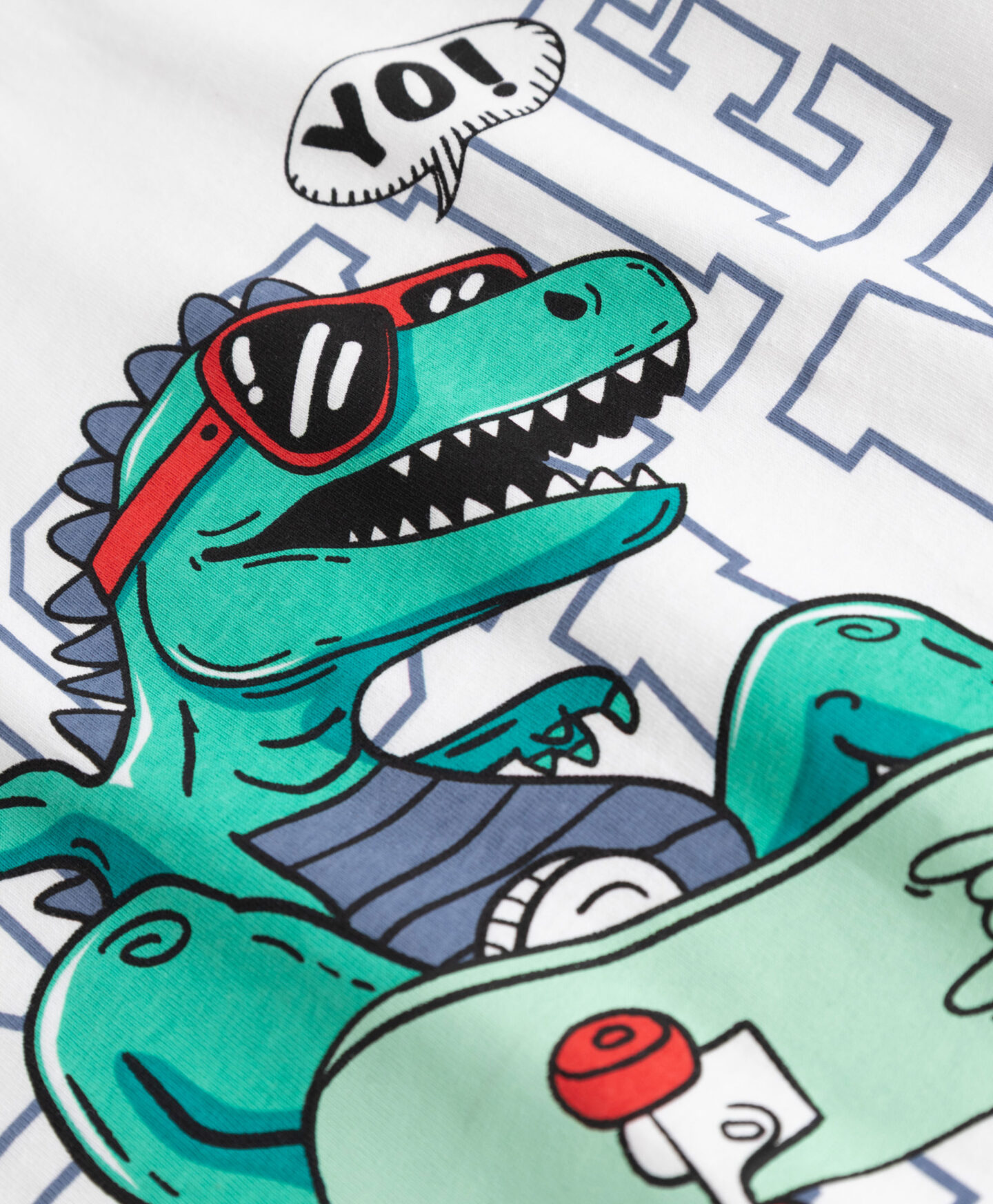 Bērnu 100% kokvilnas T-krekls ar īsām piedurknēm un dinozauru apdruku. Ideāli piemērots bērnudārzam, skolai vai atpūtai pēc tās. Mīkstais materiāls maigi ieskauj bērna ādu un nodrošina komfortu katrā kustībā.