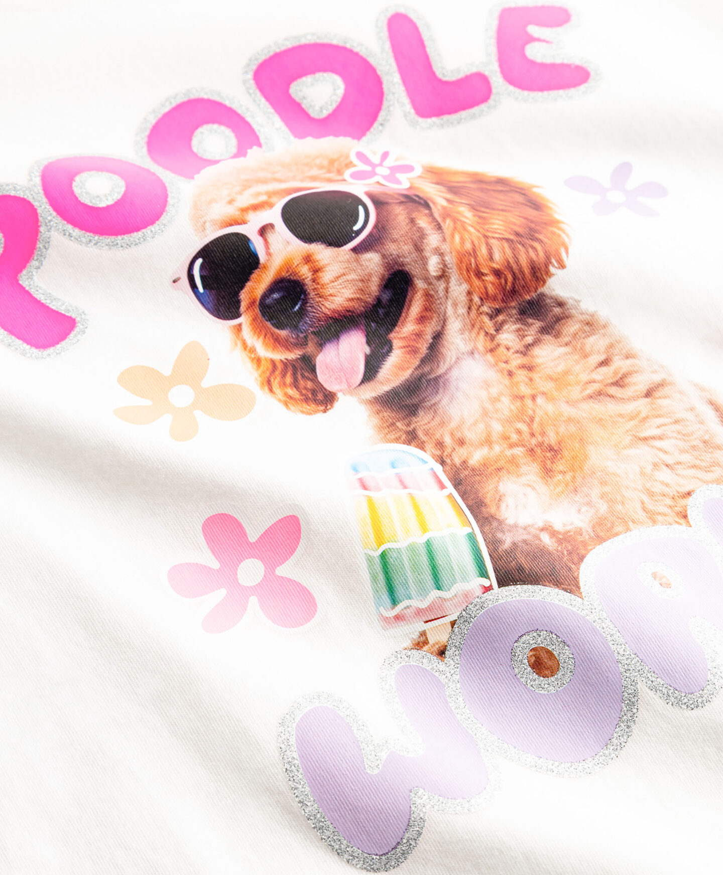 Šis bērnu T-krekls no 100% kokvilnas ar burvīgu suņa uzdruku ir piemērots visiem mazajiem dzīvnieku mīļotājiem. Kokvilna ļauj ādai elpot, nodrošinot komfortu visas dienas garumā.