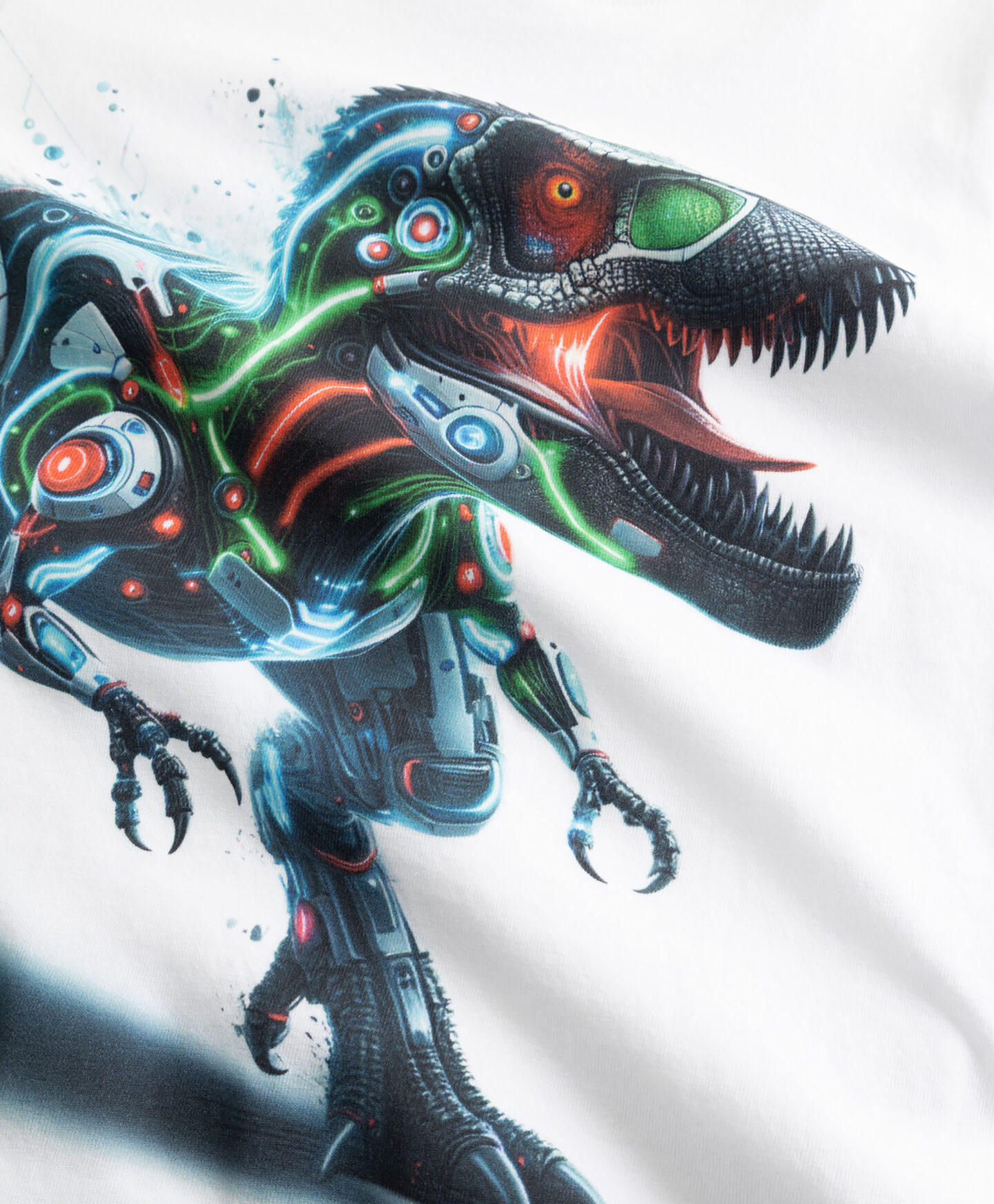Bērnu T-krekls ar dinozauru un īsām piedurknēm ir izgatavots no 100% kokvilnas un ar dinamisku grafiku priekšpusē. Tas lieliski der kā bāzes elements dažādās apģērbu kombinācijās, kreklu var vilkt kopā ar džemperi vai siltākās dienās – atsevišķi. Elpojošais materiāls ir patīkams, piemērots bērna jutīgajai ādai, nodrošinot maksimālu valkāšanas komfortu. Šāds krekls labi izskatās gan ar džinsiem, gan sporta biksēm.