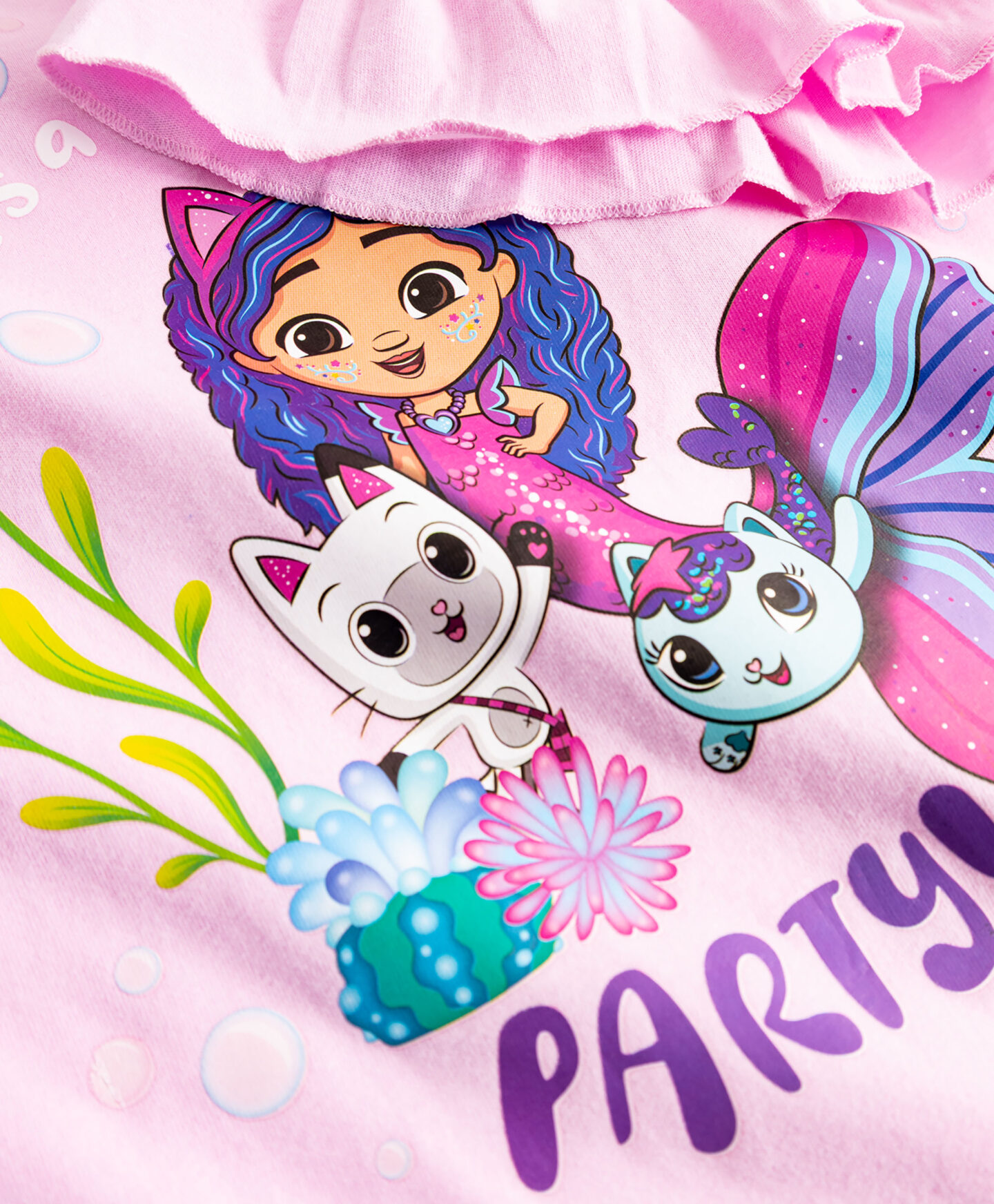 Bērnu T-krekls GABIJAS LEĻĻU MĀJA, kas izgatavots no 100% kokvilnas, ir ar volāniem uz piedurknēm un ideāli piemērots mazajiem animācijas seriāla faniem. Mīkstais materiāls ir neticami patīkams ādai, turklāt ļauj tai elpot. T-krekls lieliski noderēs siltās dienās, nodrošinot bērnam maksimālu valkāšanas komfortu. Tas lieliski izskatīsies kopā ar džinsiem, legingiem vai svārkiem.