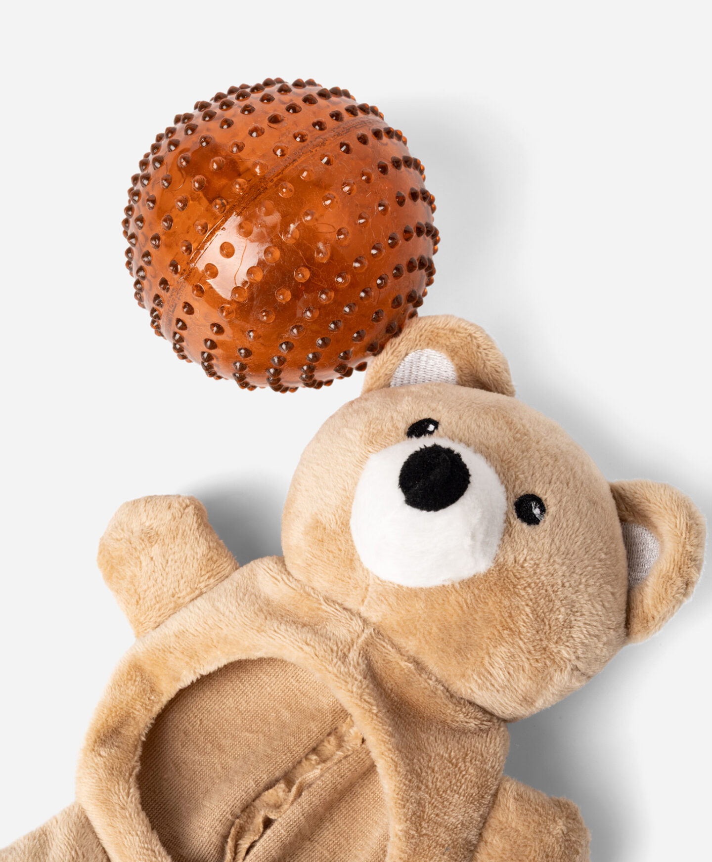 Pūkaina, bēša suņu rotaļlieta ar bumbiņu ir ideāls risinājums suņiem, kas mīl interaktīvas un mīkstas rotaļlietas. Izgatavota no mīksta, bet izturīga materiāla, tā nodrošina drošas rotaļas, turklāt komplektā iekļautā bumbiņa piešķir papildu jautrību un mudina suni kļūt aktīvākam.