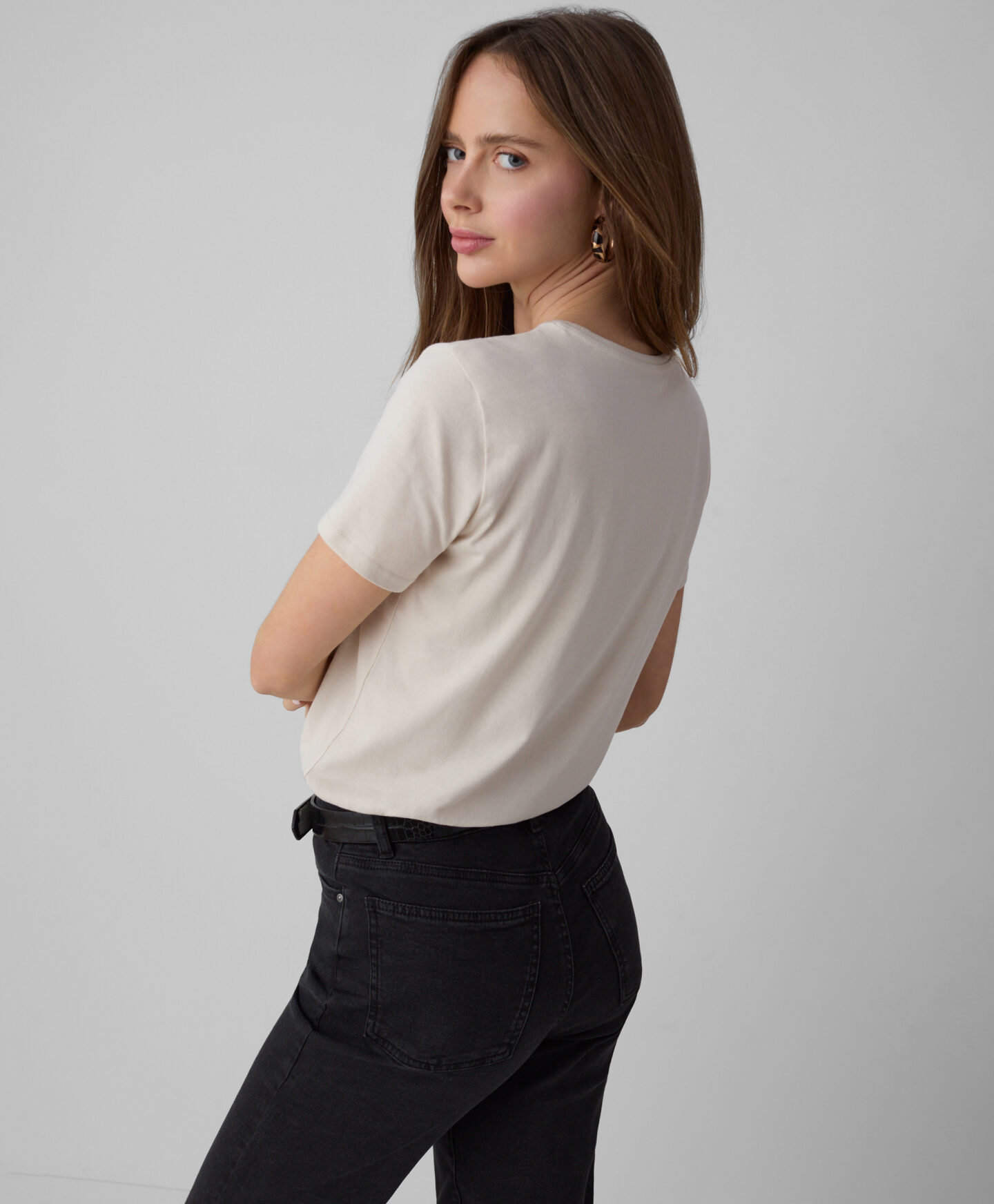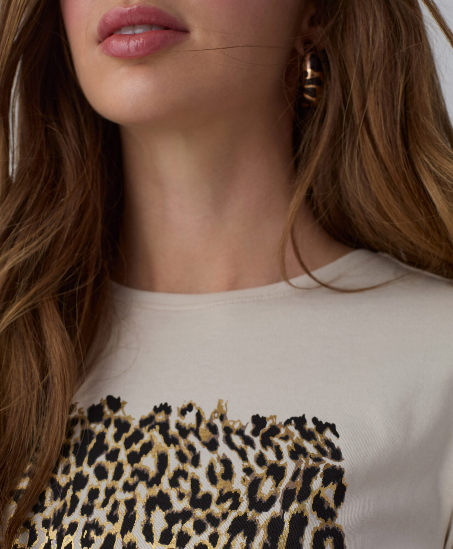 Bēšs T-krekls, kas izgatavots no 100% kokvilnas, ar apdruku piešķir spožumu jebkuram apģērbam. Dabiskais materiāls ir maigs ādai un nodrošina pilnīgu komfortu. T-krekls ir kombinējams ar dažādiem apģērbiem. Kopā ar sportiskām biksēm vai džinsiem tas rada daudzpusīgu izskatu, bet eleganti aksesuāri piešķir tam izsmalcinātāku efektu.