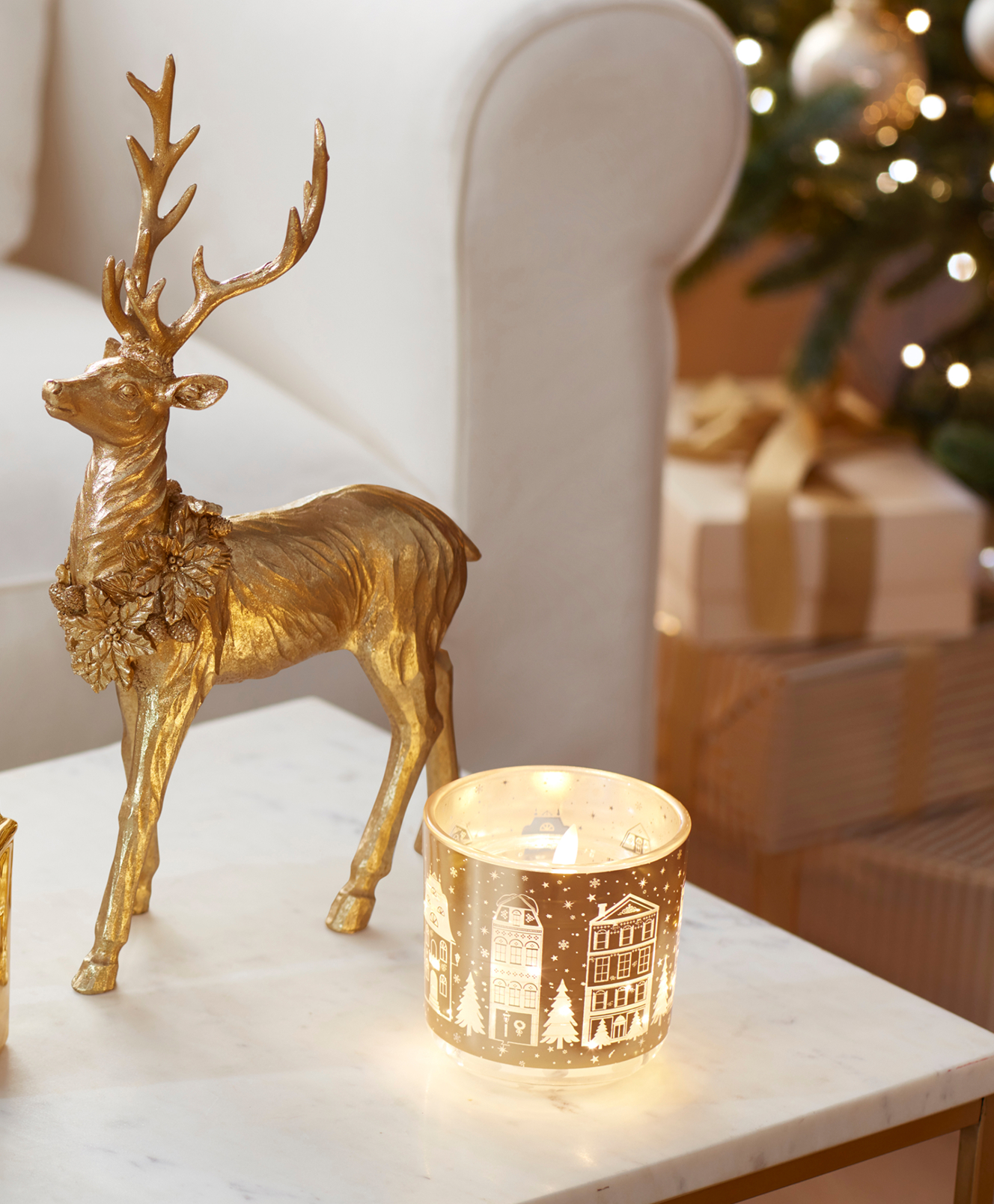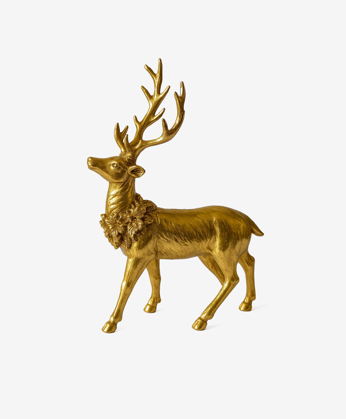 Briedis ar vainagu un zelta akcentiem ir klasiska figūriņa mūsdienu izpildījumā. Spīdošie rotājumi izceļ katru detaļu, bet elegantais vainags rada svētku noskaņu. Šis rotājums interjeram piešķir pasaku majestātisko šarmu, kļūstot par vienu no galvenajiem Ziemassvētku kompozīcijas elementiem.