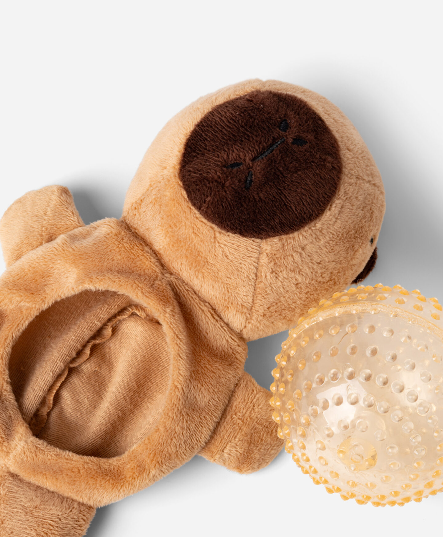 Pūkaina, brūna suņu rotaļlieta ar bumbiņu ir ideāls risinājums suņiem, kas mīl interaktīvas un mīkstas rotaļlietas. Izgatavota no mīksta, bet izturīga materiāla, tā nodrošina drošas rotaļas, turklāt komplektā iekļautā bumbiņa piešķir papildu jautrību un mudina suni kļūt aktīvākam.