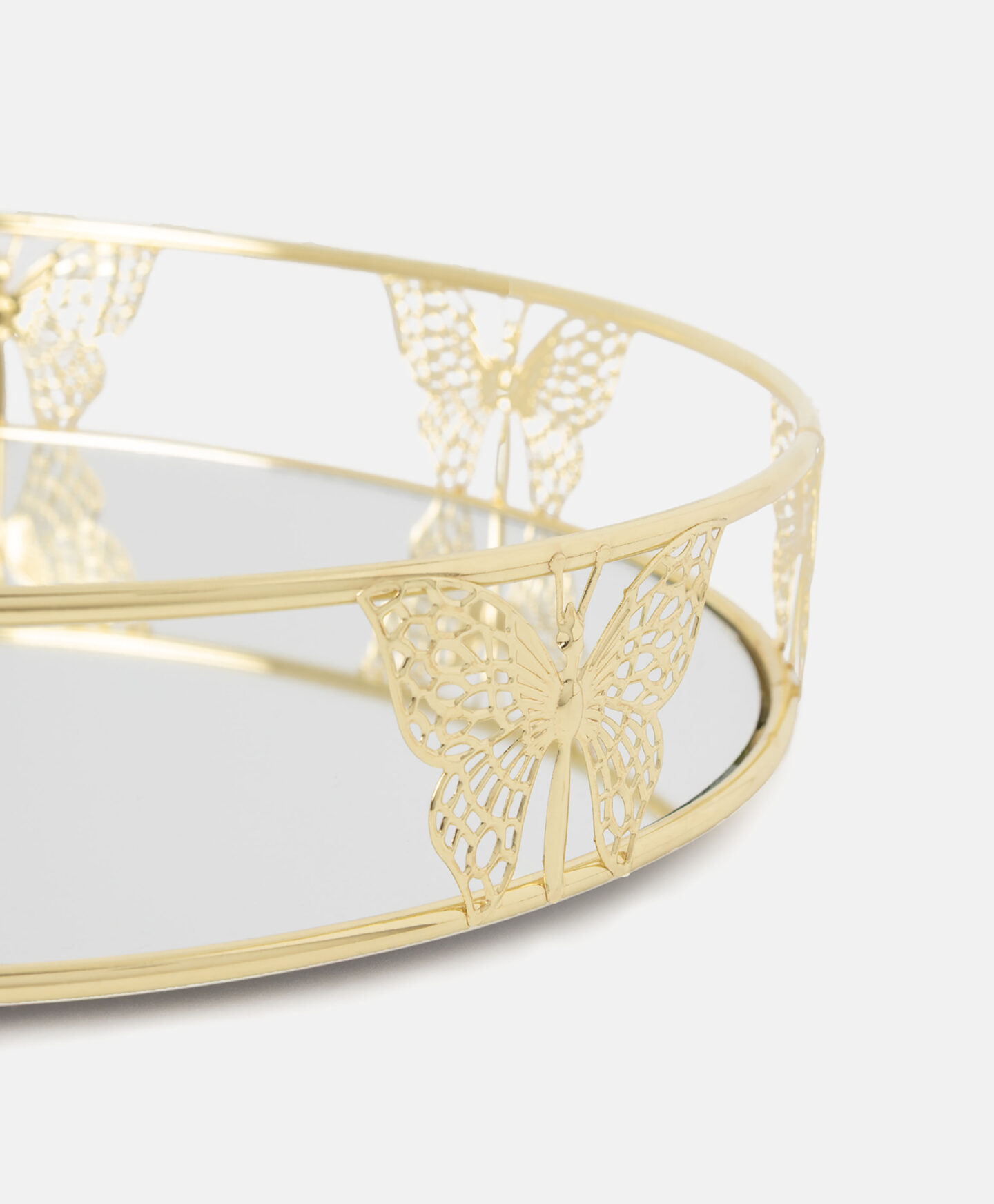 Dekoratīvs trauks ar spoguļveida pamatni ir gaumīgs papildinājums jebkuram interjeram. Tas skaisti izrotās viesistabu, guļamistabu vai virtuvi. Trauks lieliski izskatās kā pamatne aromātiskajām svecēm un vāzēm, bet ir piemērots arī dzērienu un saldumu pasniegšanai. Zelta tauriņu motīvs padara šo paplāti ļoti gaišu, turklāt spogulis skaisti atstaro gaismu.