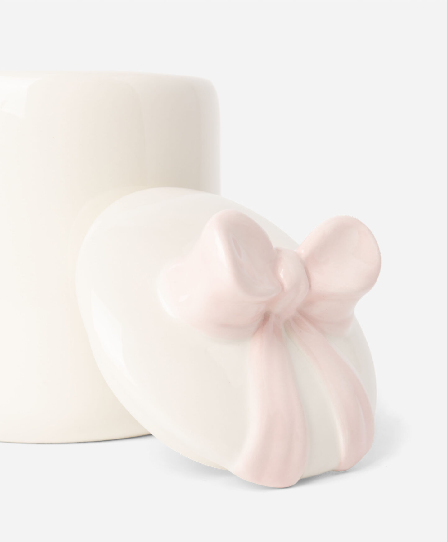 A dolomite container ar vāku decorated with a 3D bow will add charm to your kitchen. Not only does it look beautiful on the countertop, but it also keeps stored products fresh for longer. With a capacity of over 1000 ml, it can hold cookies, candies, or other treats. Such a container is also a good gift idea.