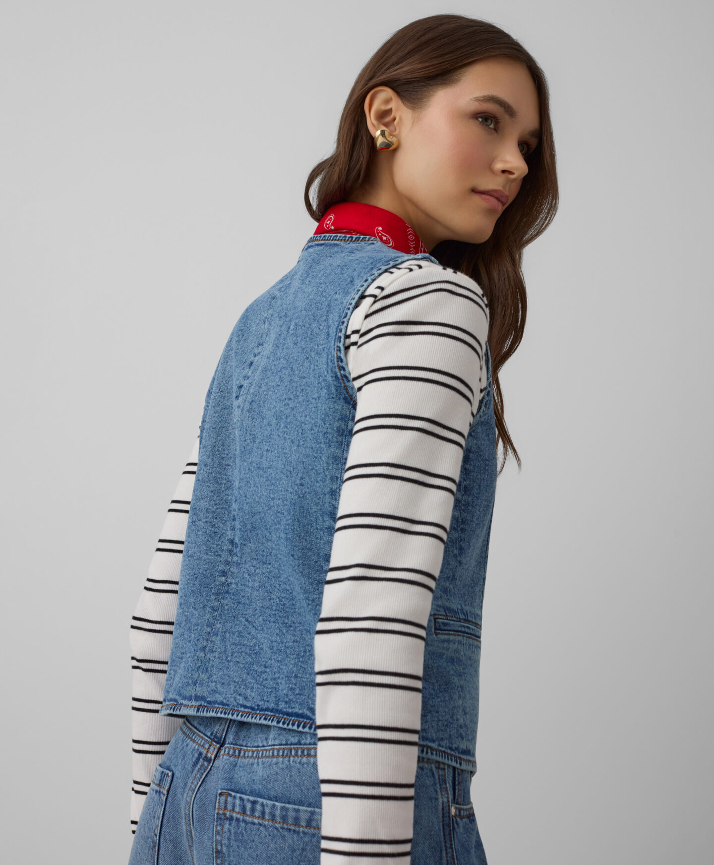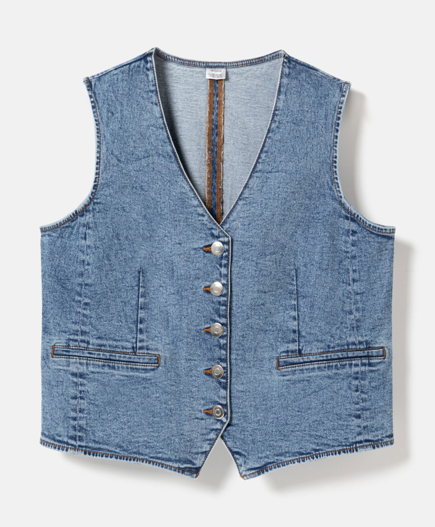 Džinsa veste ar augstu kokvilnas saturu labi sader ar dažādiem apģērbiem. Tas ir ideāls aksesuārs, kas papildinās gan elegantu kreklu, gan neformālāku T-kreklu. Nelielā elastāna piedeva nodrošina ideālu piegulumu augumam.