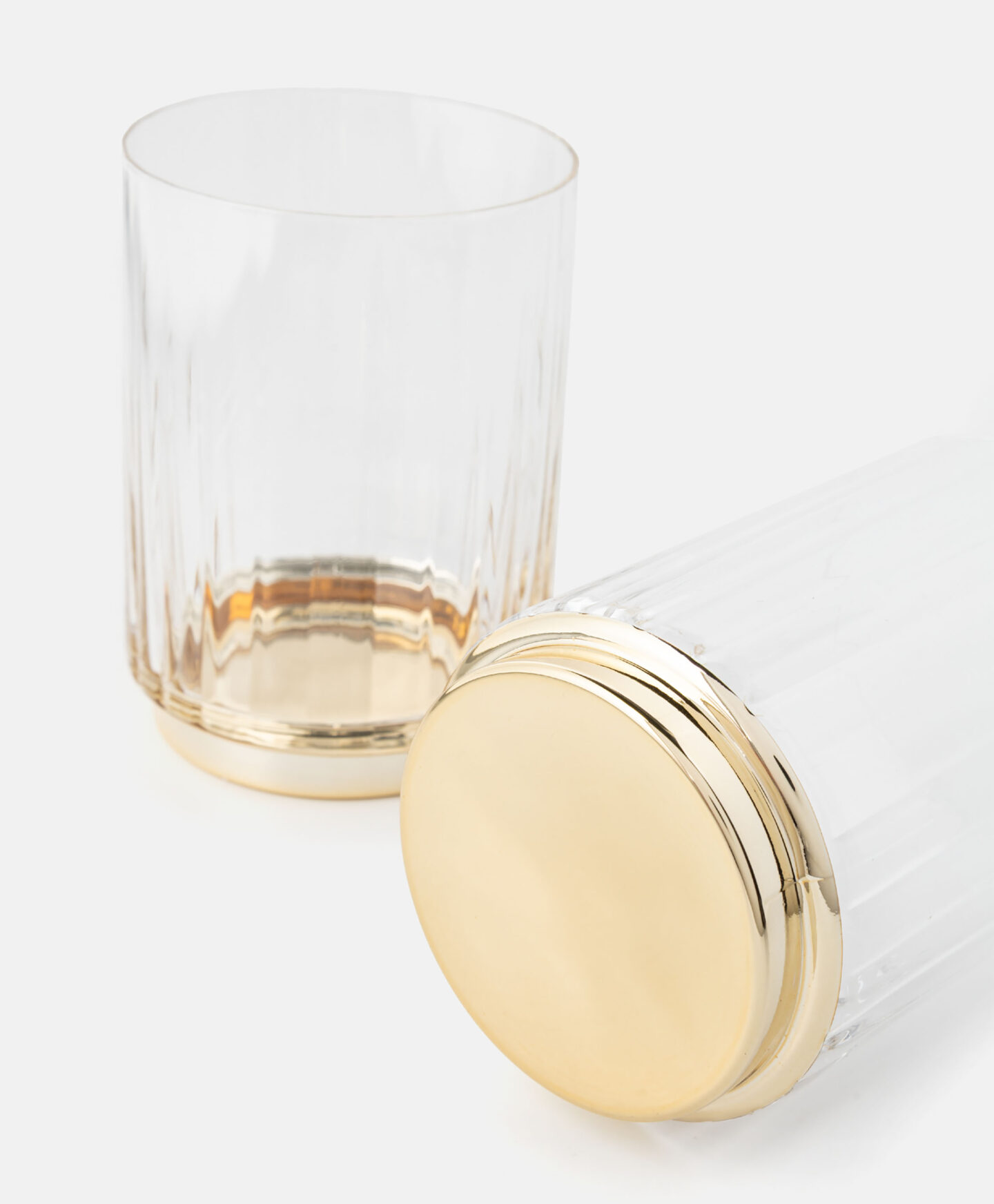 2 rievotu glāžu komplekts ar zelta pamatni ir ierosinājums tiem, kas novērtē elegantus ikdienas priekšmetus. Precīzais rievojums piešķir glāzēm īpašu šarmu, bet zelta pamatne – greznības pieskārienu. Ideāli piemērotas gan īpašiem gadījumiem, gan ikdienas lietošanai. Tās ir lieliska ideja dāvanai un dekoratīvs papildinājums galda piederumiem. Piedāvājumā ir pieejamas arī vīna glāzes.
