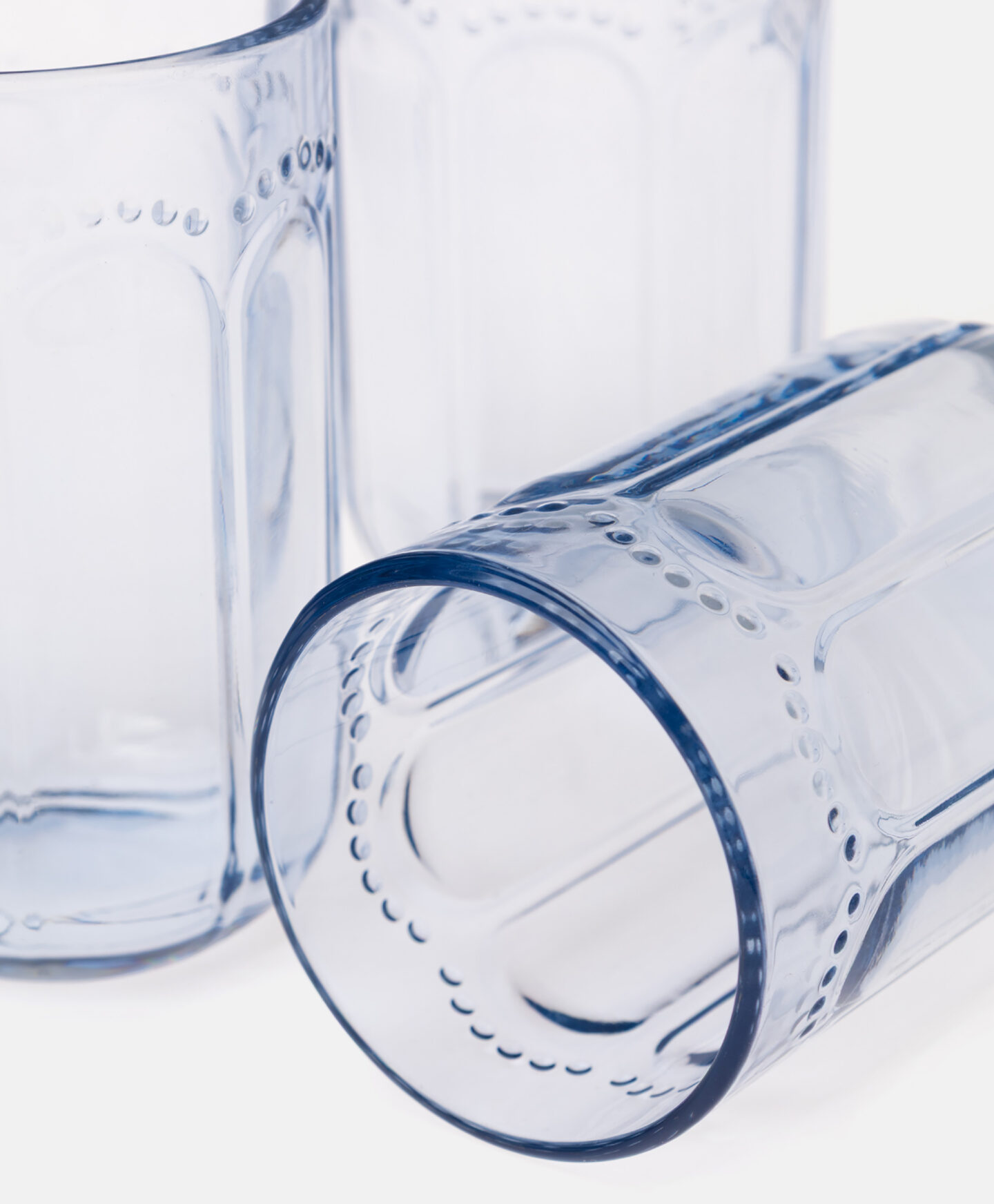 Šis 4 glāžu komplekts izcelsies virtuves plauktos. Stikls skaisti atstaro gaismu, radot interesantu vizuālo efektu un piešķirot eleganci jebkuram galda klājumam. Tas ir arī stingrs, izturīgs pret skrāpējumiem un nodrošina neitrālu garšu pasniegtajiem dzērieniem. Piedāvājumā ietilpst ideāli pieskaņota krūka un glāžu ar kājiņu komplekts.