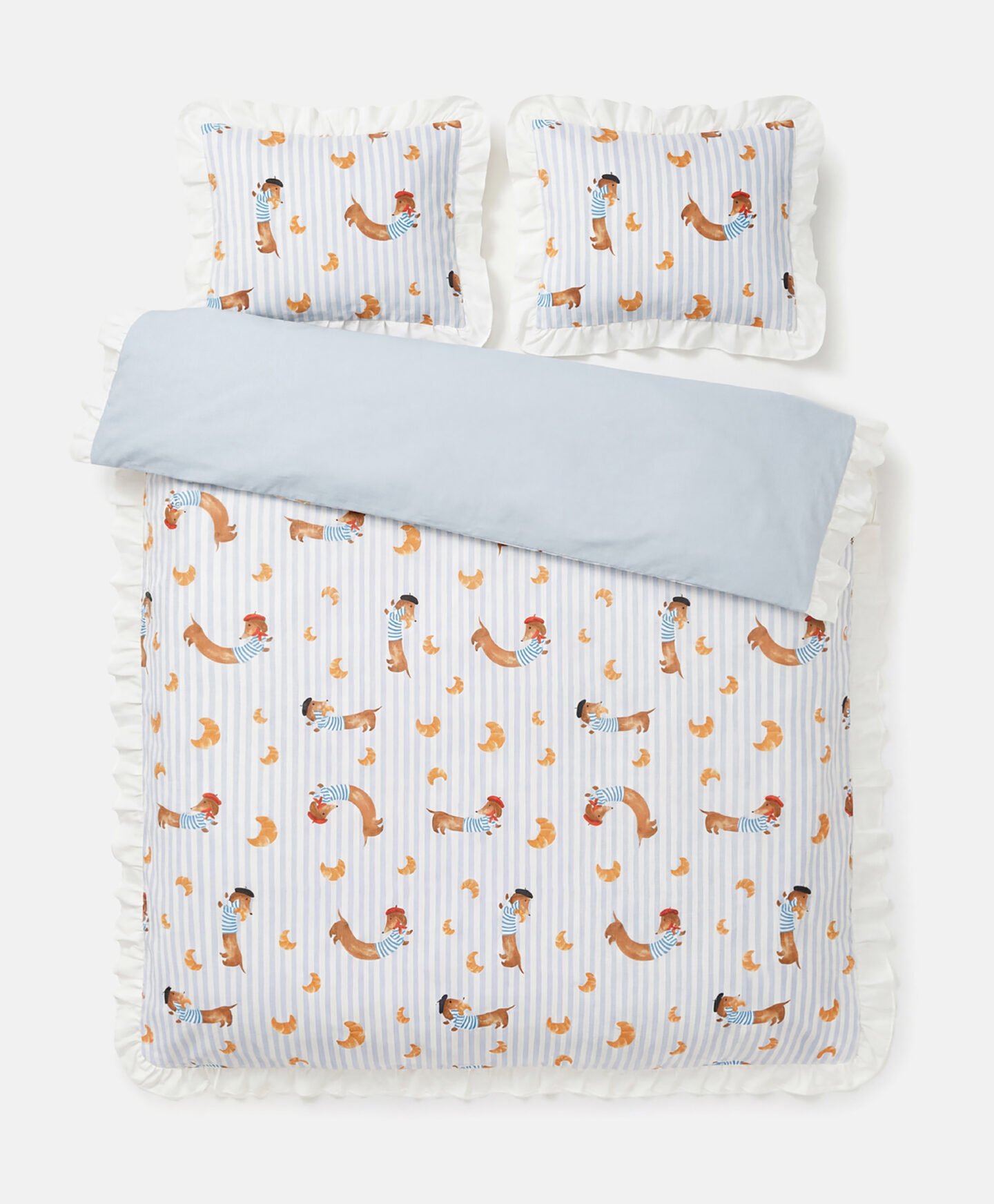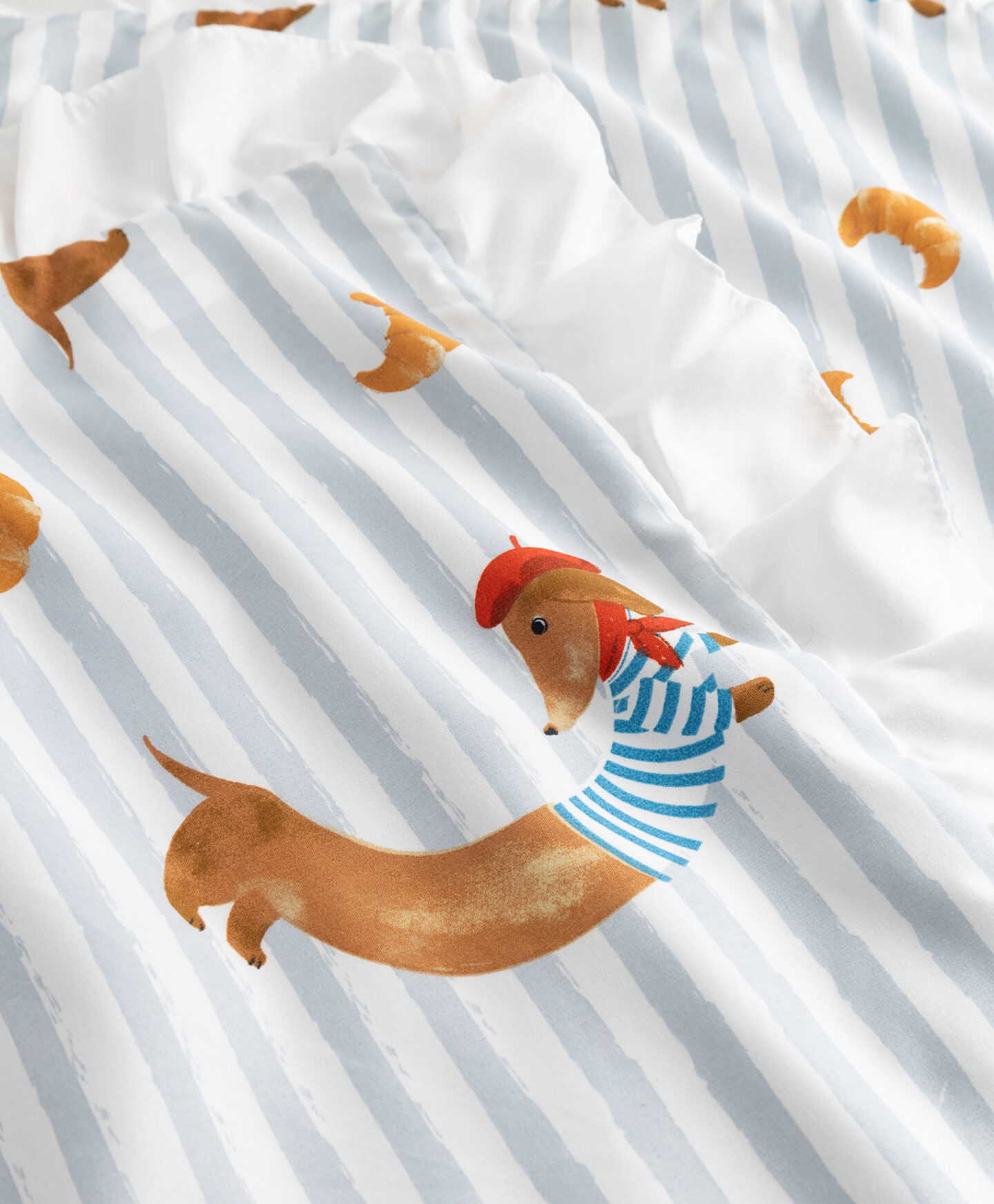 Šis 200 x 220 cm lielais gultasveļas komplekts ar takšu motīvu ir lieliski piemērots tiem, kas meklē stilīgu gultasveļu savai guļamistabai. Baltā krāsa kopā ar burvīgo motīvu, kurā attēloti suņi beretēs, piešķirs elegantu akcentu jebkuram interjeram. Komplektā ietilpst 200 x 200 cm liels segas pārvalks un divas 50 x 60 cm lielas spilvendrānas.