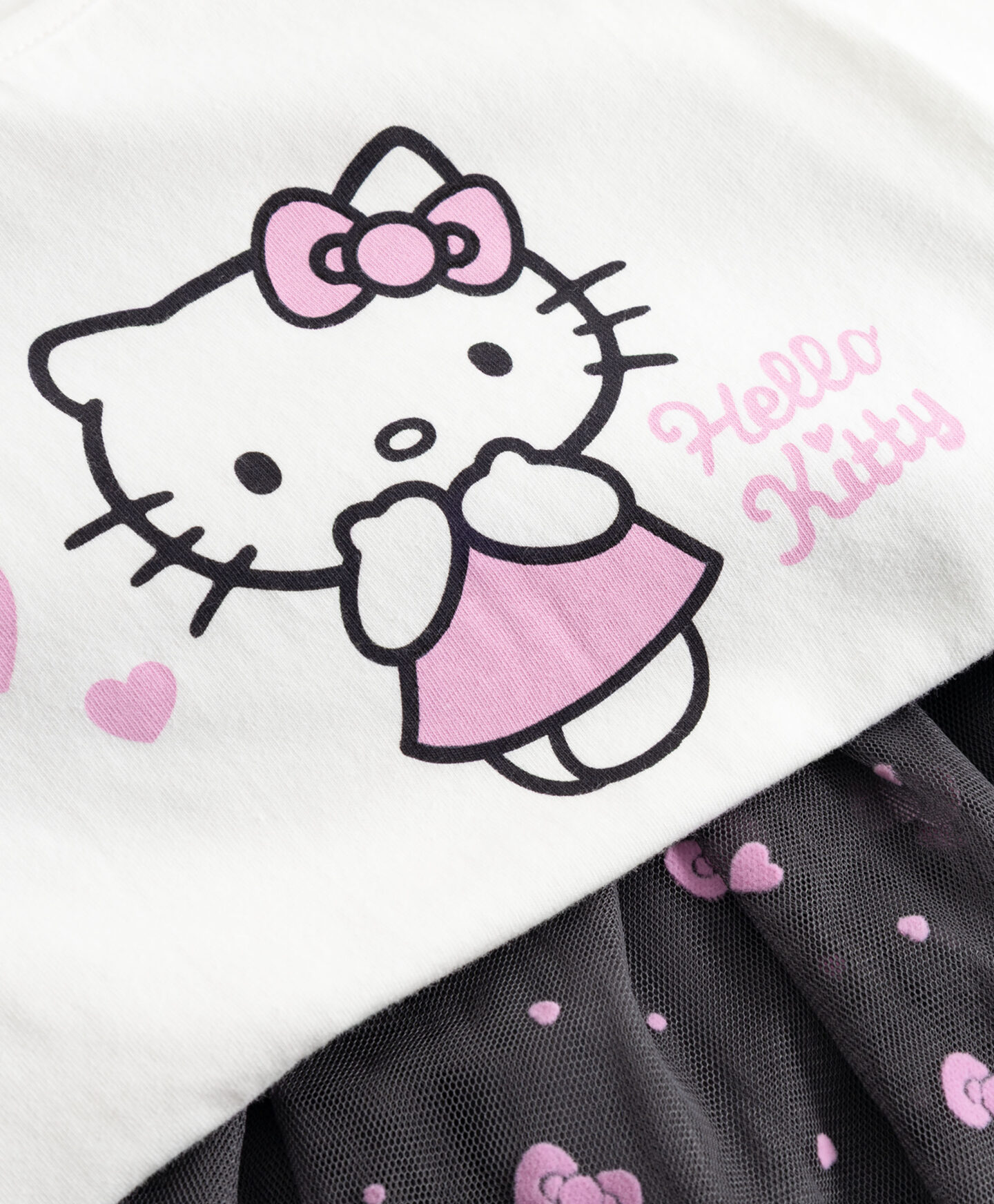 HELLO KITTY kleita ar garām piedurknēm ir gatavs tērps, kas piemērots gan bērnu dārzam, gan īpašiem notikumiem. Plisētie tilla svārki un skaistais attēls priekšpusē liks katram mazajam HELLO KITTY fanam justies īpaši. Augšdaļa, kas izgatavota no elastīga materiāla ar augstu kokvilnas saturu, nodrošina, ka bērns var brīvi kustēties aktivitāšu un rotaļu laikā.