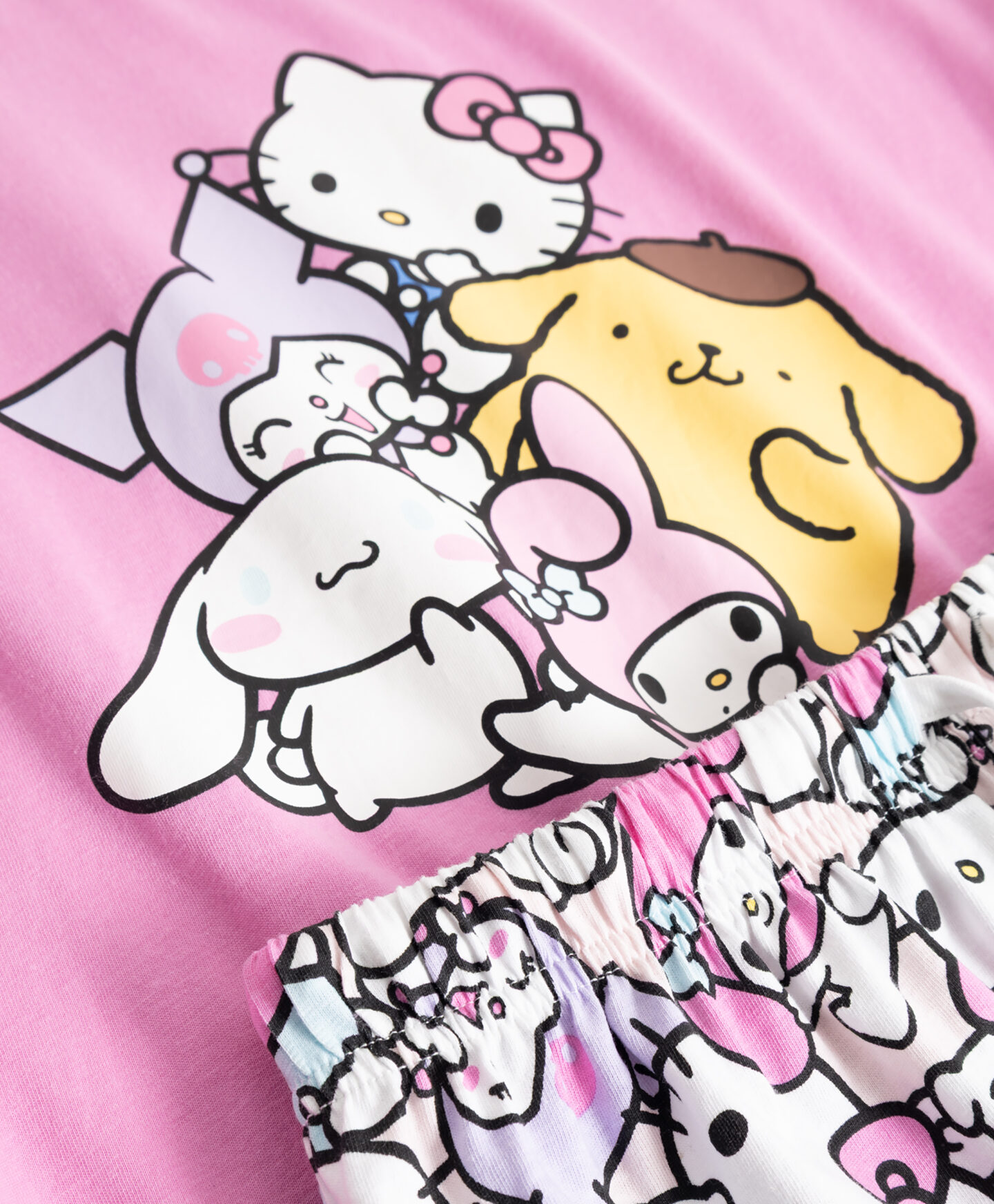 HELLO KITTY UN DRAUGI pidžama, 100% kokvilna sastāv no T-krekla un šortiem. Tā lieliski iederas siltākās naktīs, vakara relaksācijas rituālos vai nesteidzīgā nedēļas nogales rītā mājas komfortā. Mīksts materiāls patīkami apņem ādu, ļaujot tai elpot. Klasiskais piegriezums piedāvā kustību brīvību.