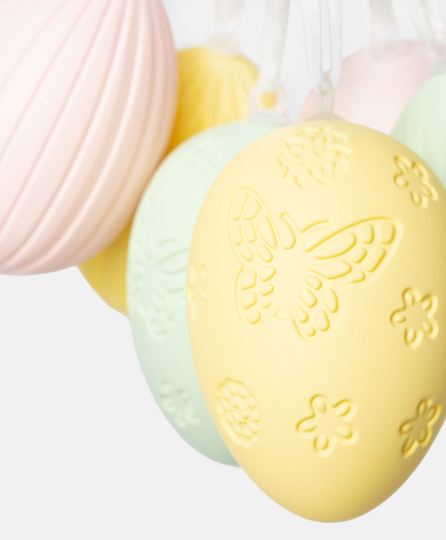 Šis plastmasas olu piekariņu komplekts sniedz visu nepieciešamo, lai izrotātu māju, automašīnu vai darba kabinetu. Piekariņi ir izgatavoti no plastmasas, tie ir viegli, izturīgi un pilnīgi droši bērniem un mājdzīvniekiem. Visas 16 olas ir pasteļtoņos, un to kompaktais izmērs padara tās ideāli piemērotas, lai piekārtu jebkurā vietā, kam vēlies piešķirt pavasara šarmu.