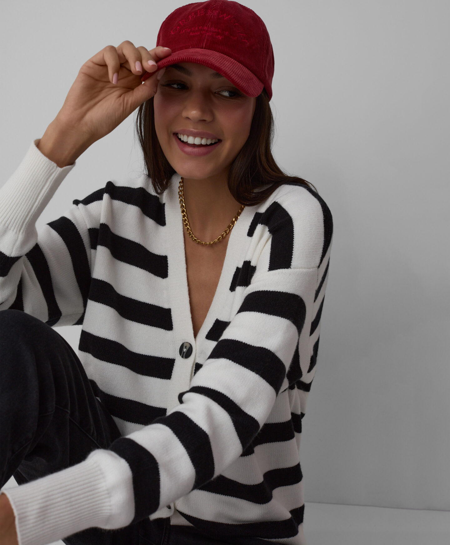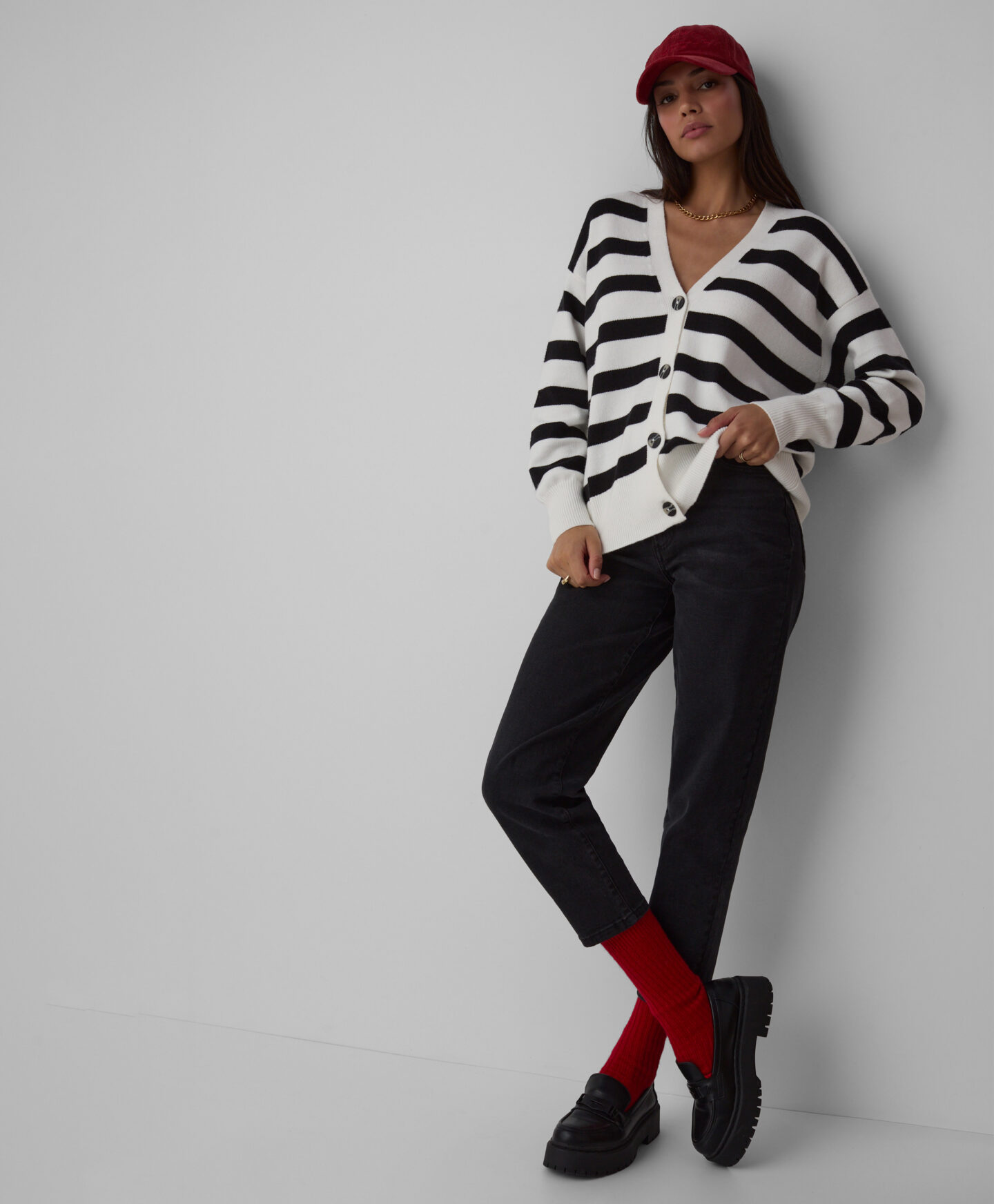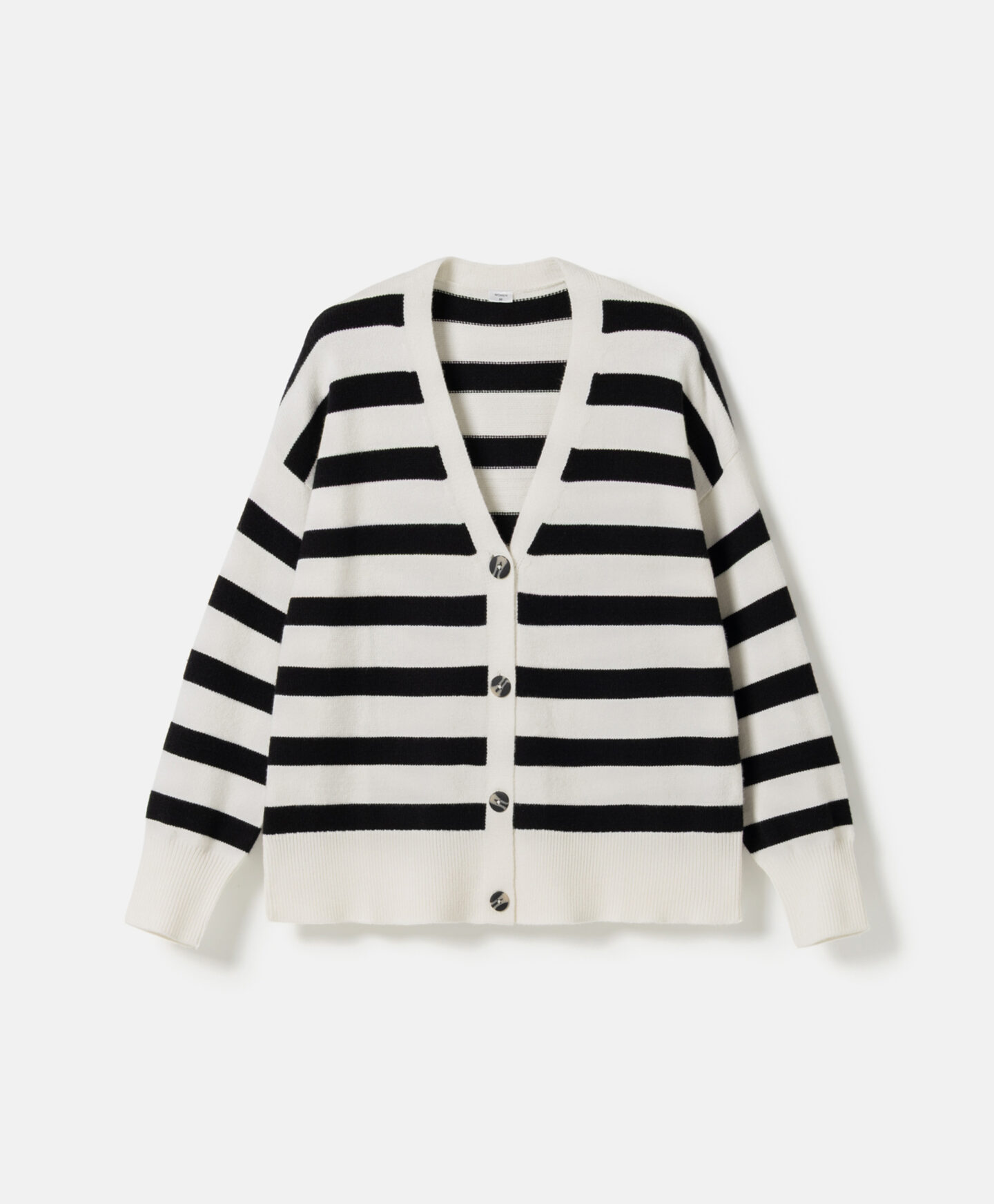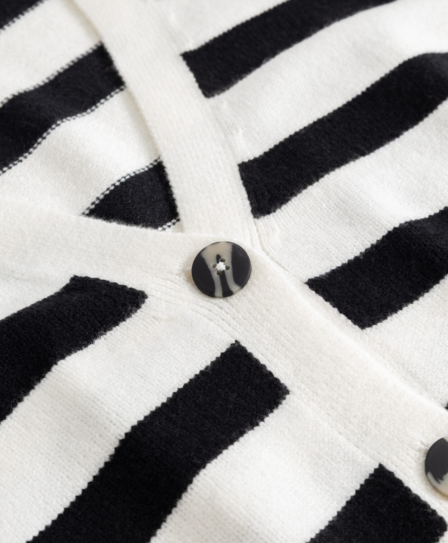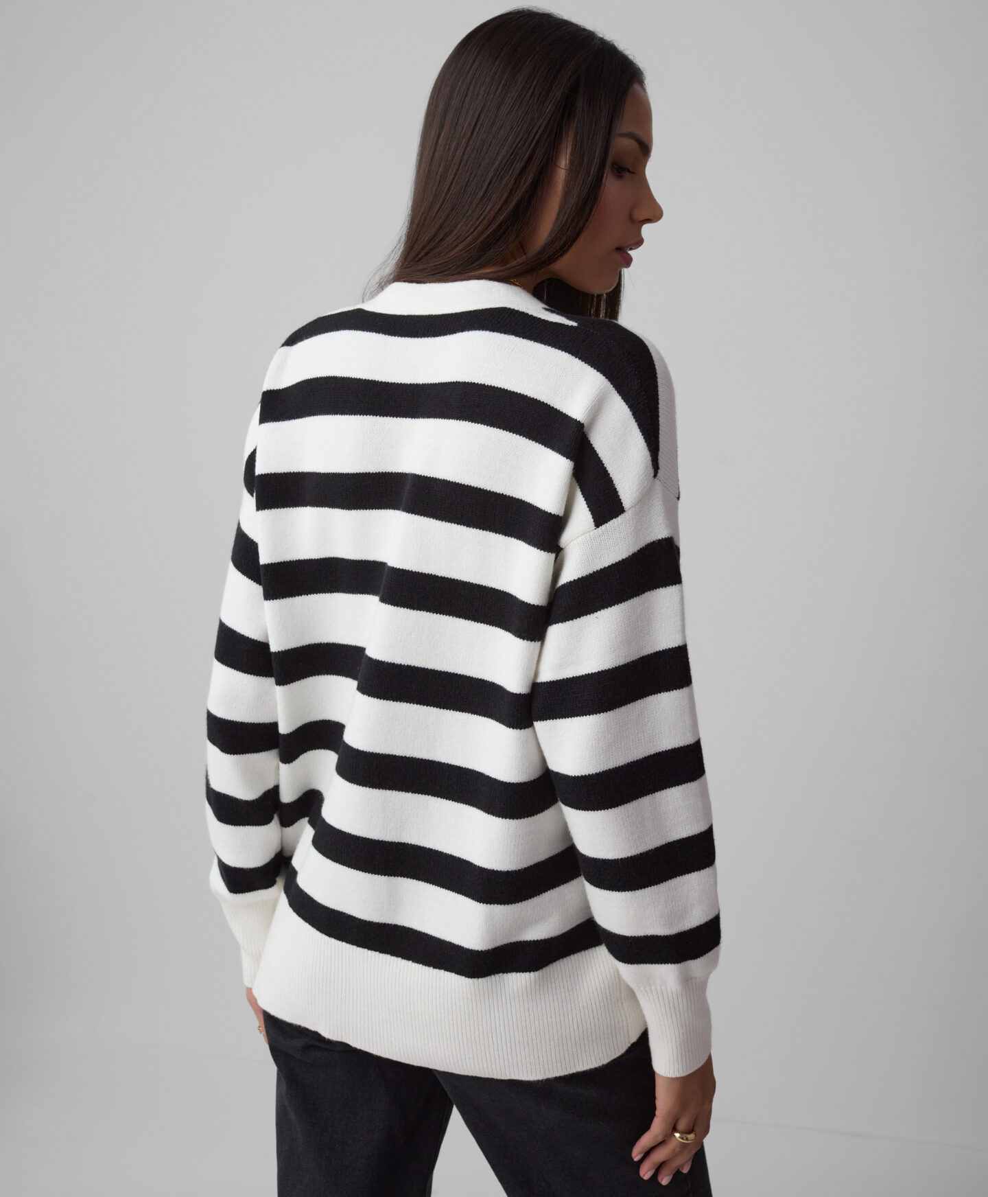 Melnbalta, svītraina, brīva piegriezuma jaka ir ideāli piemērota klasiskā stila cienītājiem, kas vēlas ērtu apģērbu. Svītrainais raksts nekad neiziet no modes un lieliski izskatās gan kopā ar elegantām biksēm, gan klasiskajiem džinsiem. Mīkstais viskozes materiāls maigi ieskauj ādu un silda aukstās ziemas dienās. Pieejami divi krāsu varianti.