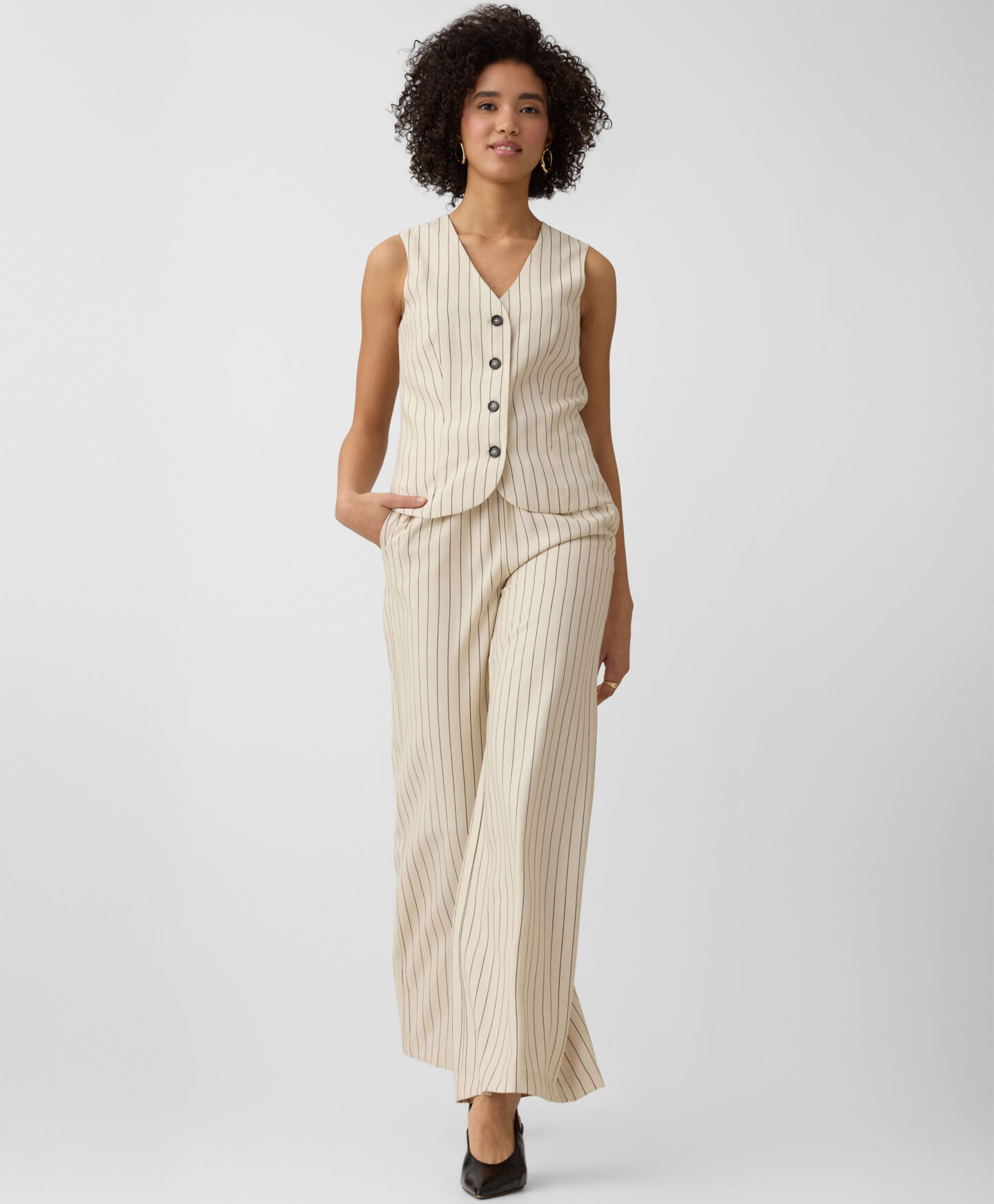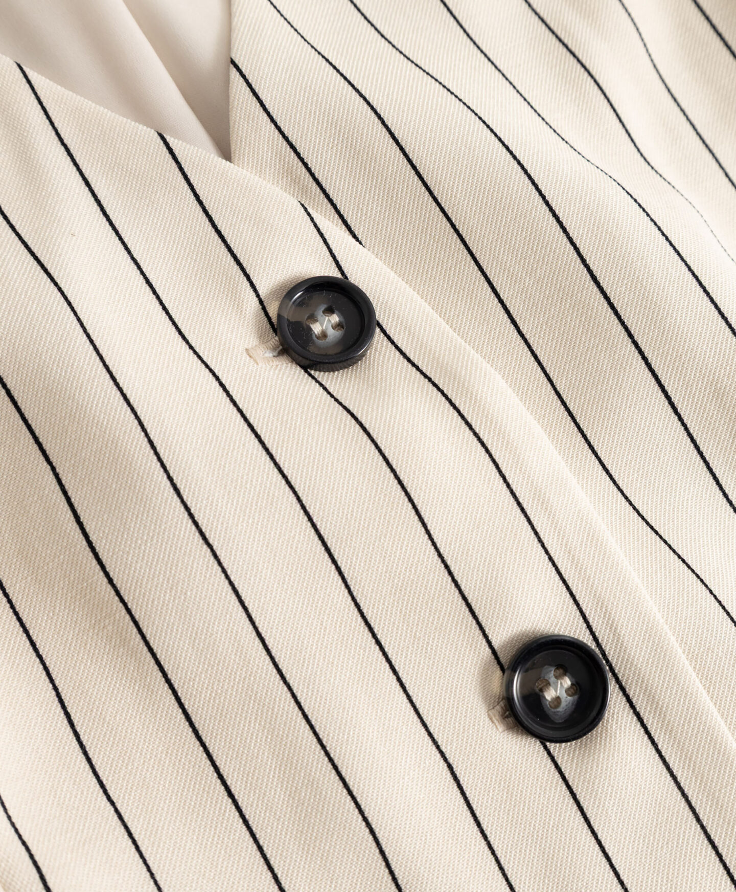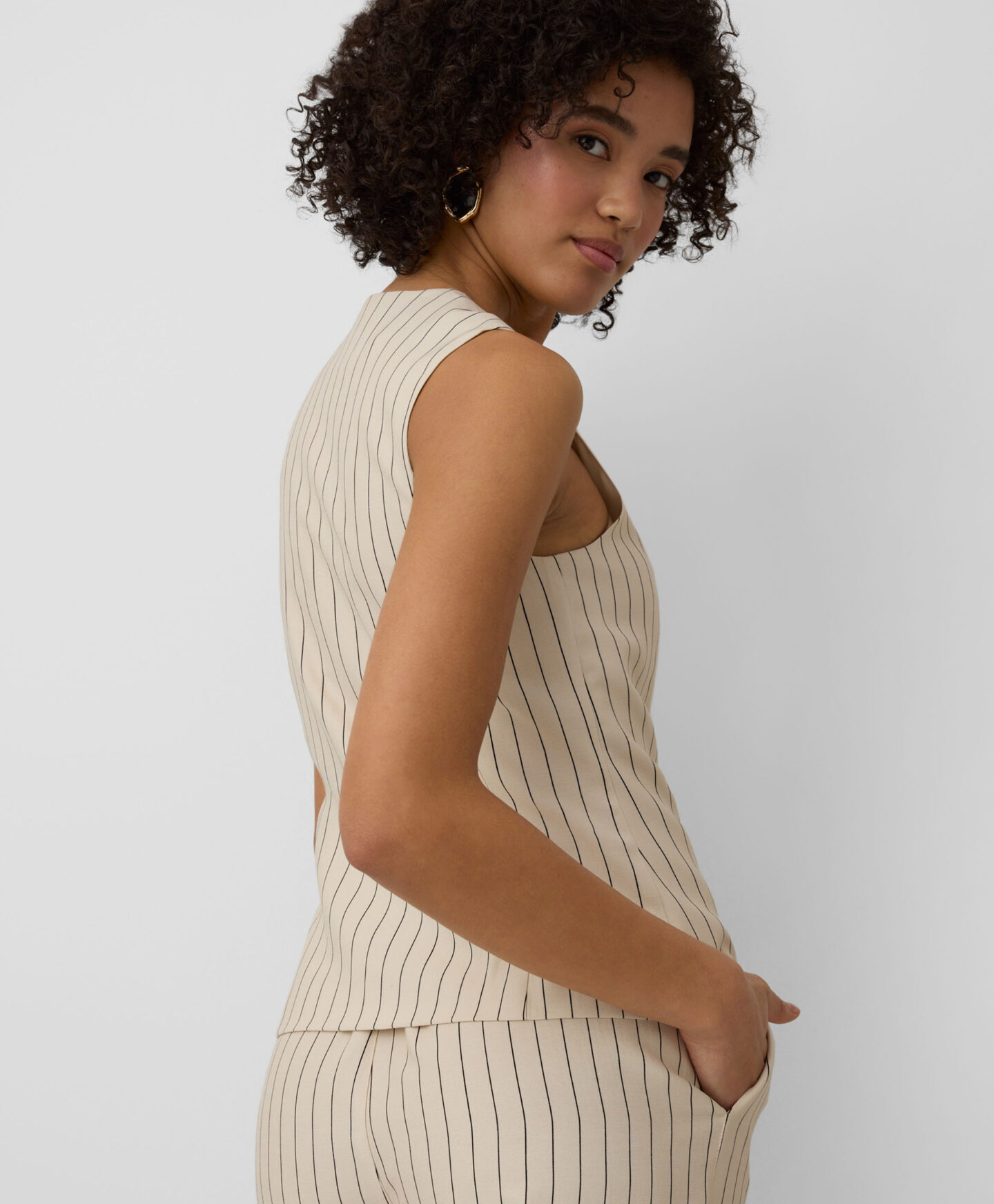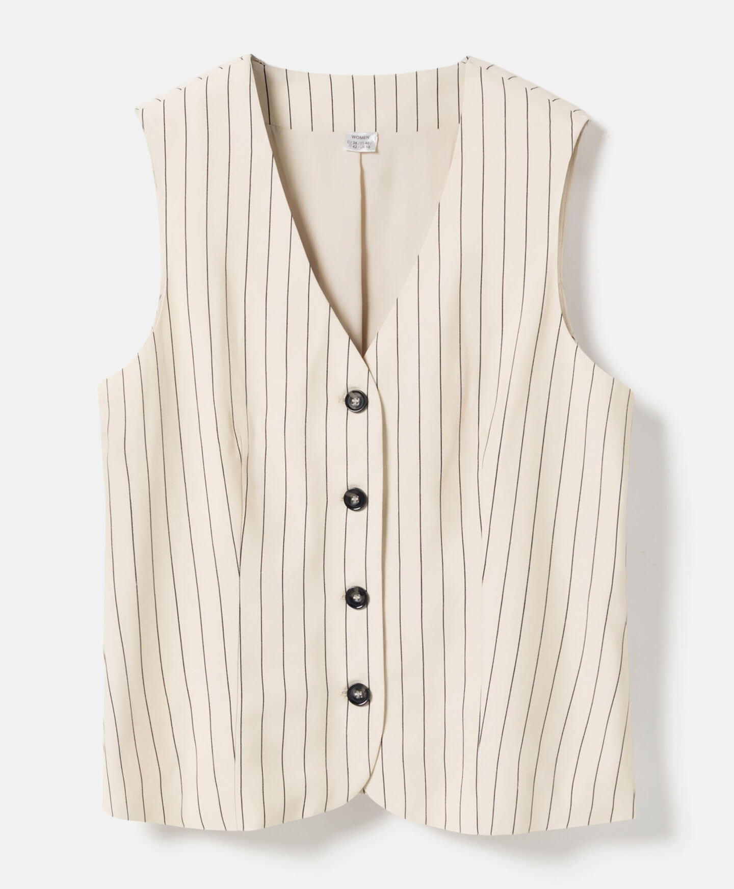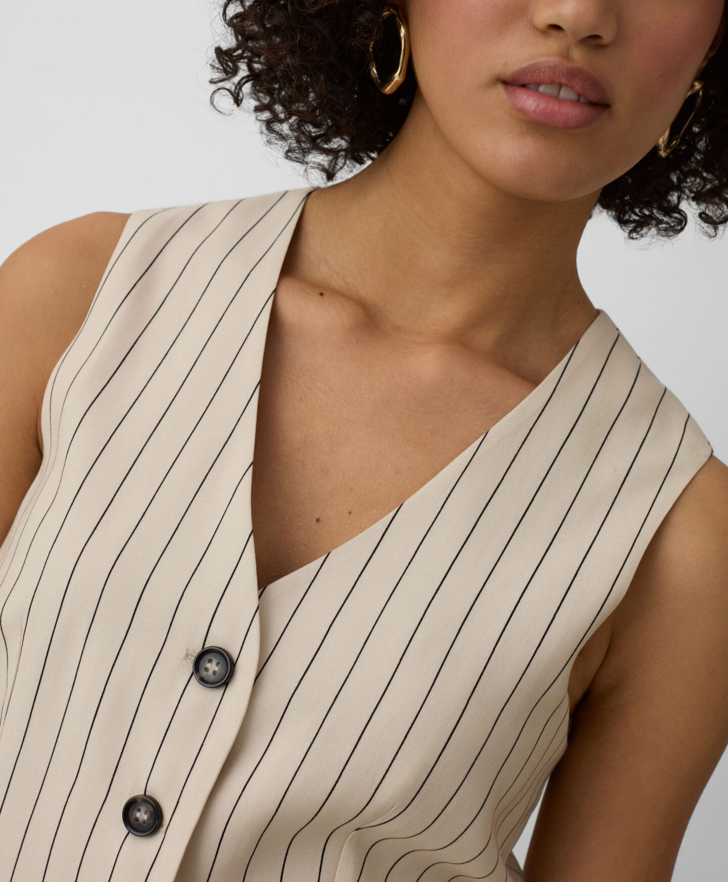 Kamizelka damska w paski tworzy zestaw ze spodniami w ten sam wzór. Wysoka zawartość wiskozy sprawia, że kamizelka jest lekka, przewiewna i doskonała na ciepłe dni. Stonowana kolorystyka jest niezwykle uniwersalna w stylizacji.