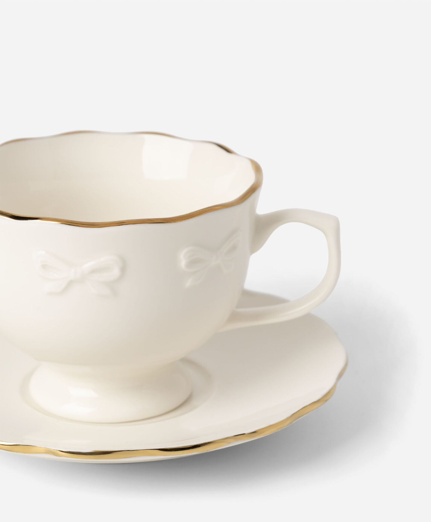 A Keramikas krūze ar apakštasīti is an elegant set perfect for serving favorite drinks like coffee or tea. The golden rim and bow motif make the cup look beautiful. Ideal as a gift for any lover of warming infusions.
