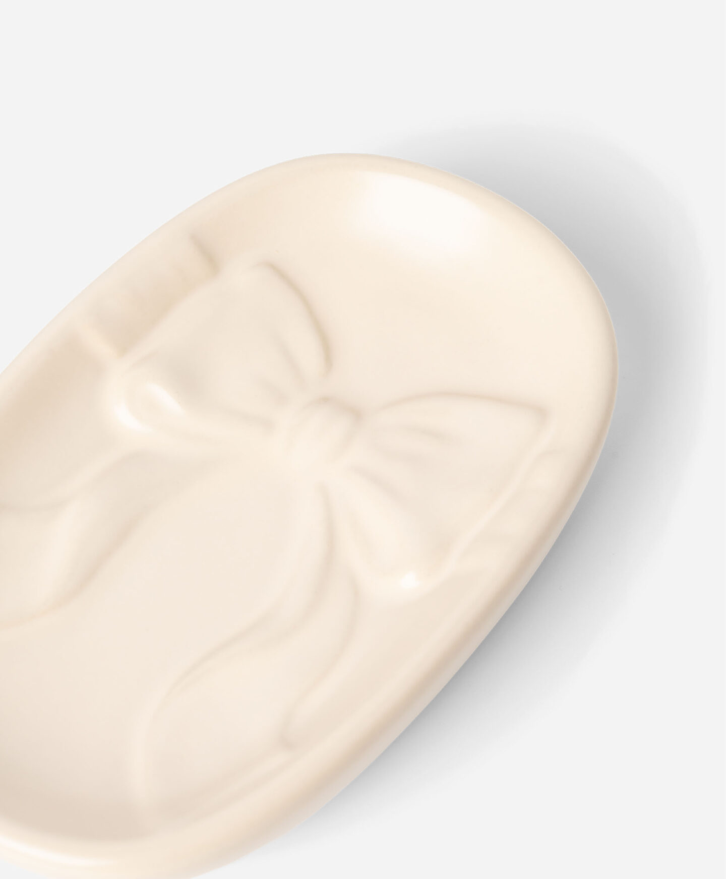 A Keramikas ziepju trauks ar banti is perfect for fans of bar soap. The dekoratīvs bow makes the dish perfectly match other bathroom accessories from the collection. Its thoughtful shape helps effectively drain water, preventing mess and keeping the soap clean.