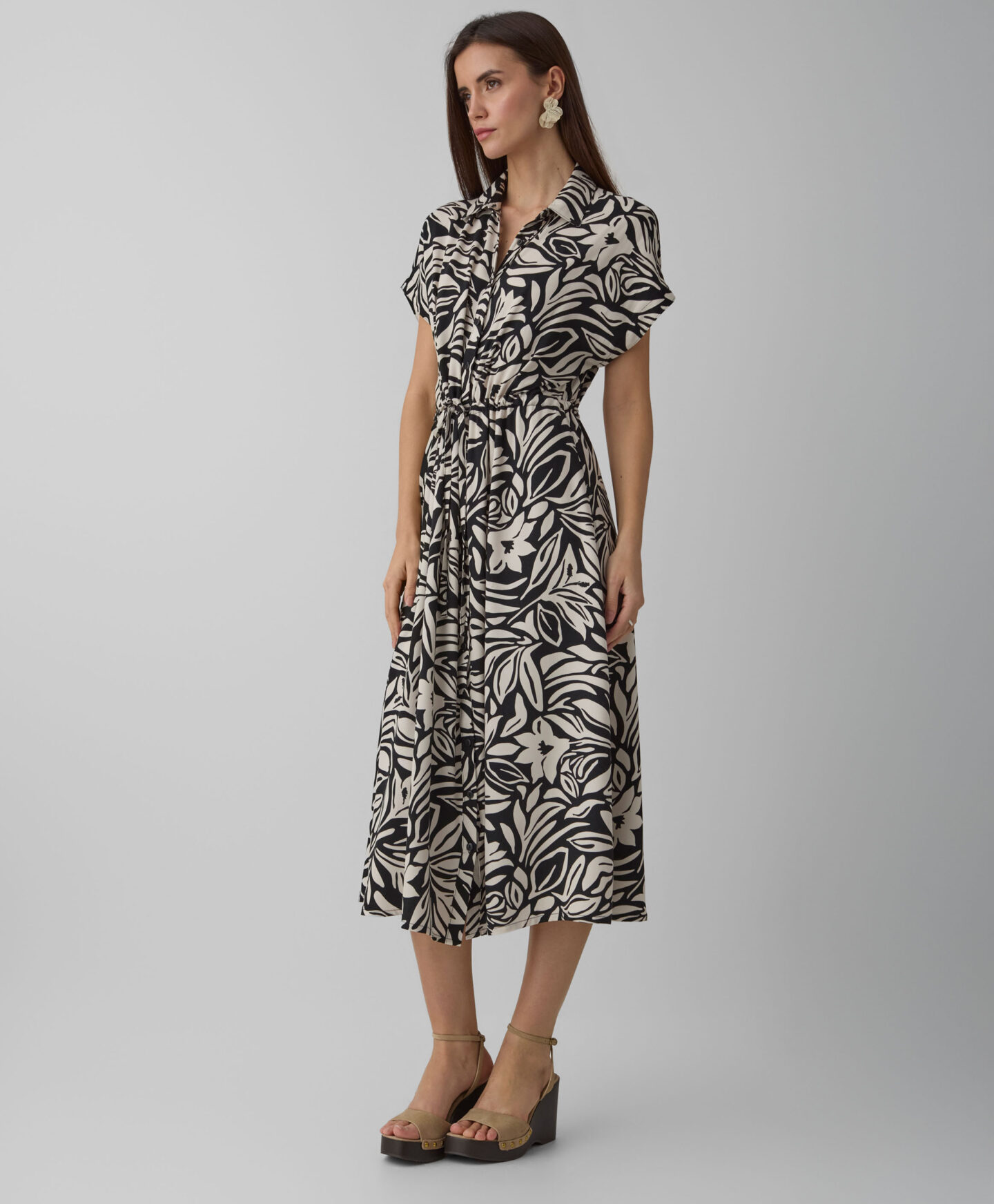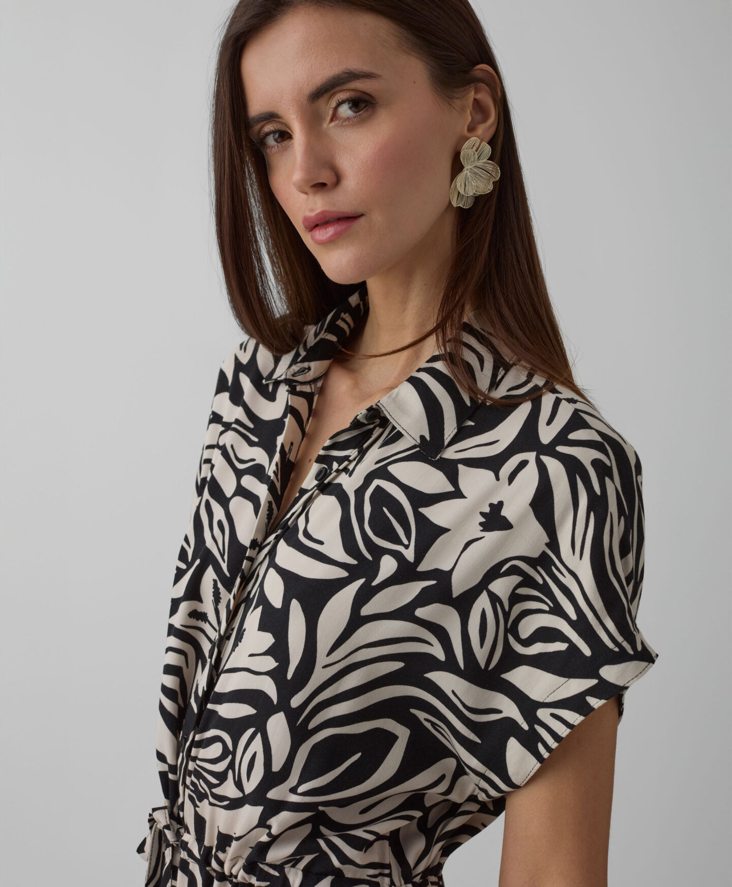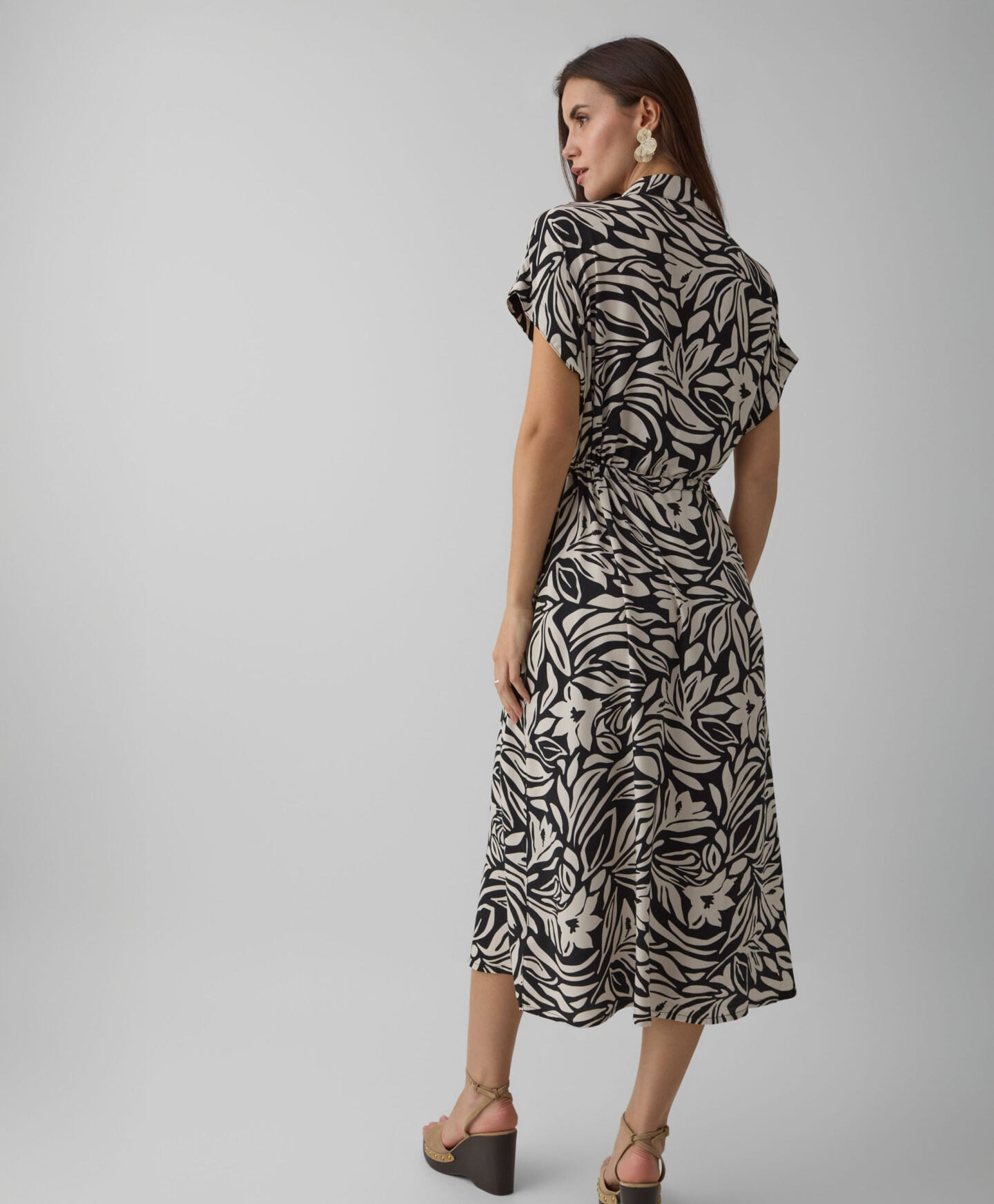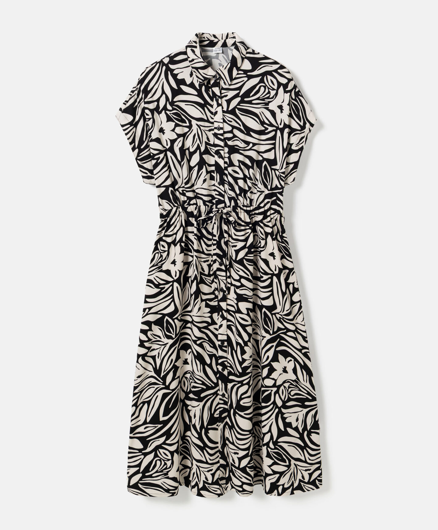 Kleita, kas izgatavota no 100% viskozes, izceļas ar skaistu rakstu. Izgatavota no patīkama materiāla, tā nodrošina komfortu jebkuros laikapstākļos. Īsās piedurknes ir ideāli piemērotas pārejas sezonai – kombinē ar džemperiem un jakām vai velc atsevišķi siltākās dienās. Universālais piegriezums ar jostiņu ļauj kleitu perfekti pielāgot dažādiem ķermeņa tipiem.