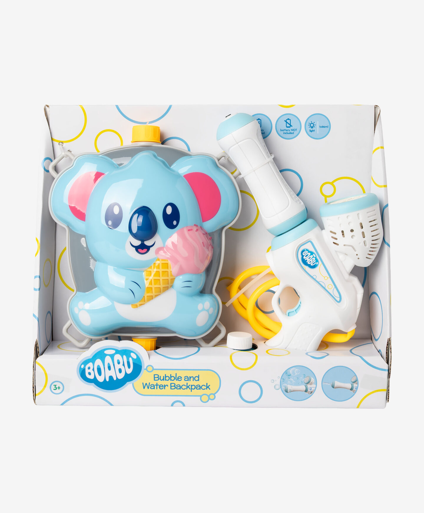 Koala burbuļu un ūdens mugursoma garantē daudzveidīgu un nebeidzamu izklaidi! Ūdens pistole ir viegli lietojama, droša un efektīva, un ūdens tvertni var viegli uzpildīt no jebkura avota. Mugursomai ir regulējamas siksnas, kas pielāgojas bērna augumam un nodrošina ērtu nēsāšanu spēles laikā. Ir pieejami divi dizaini.