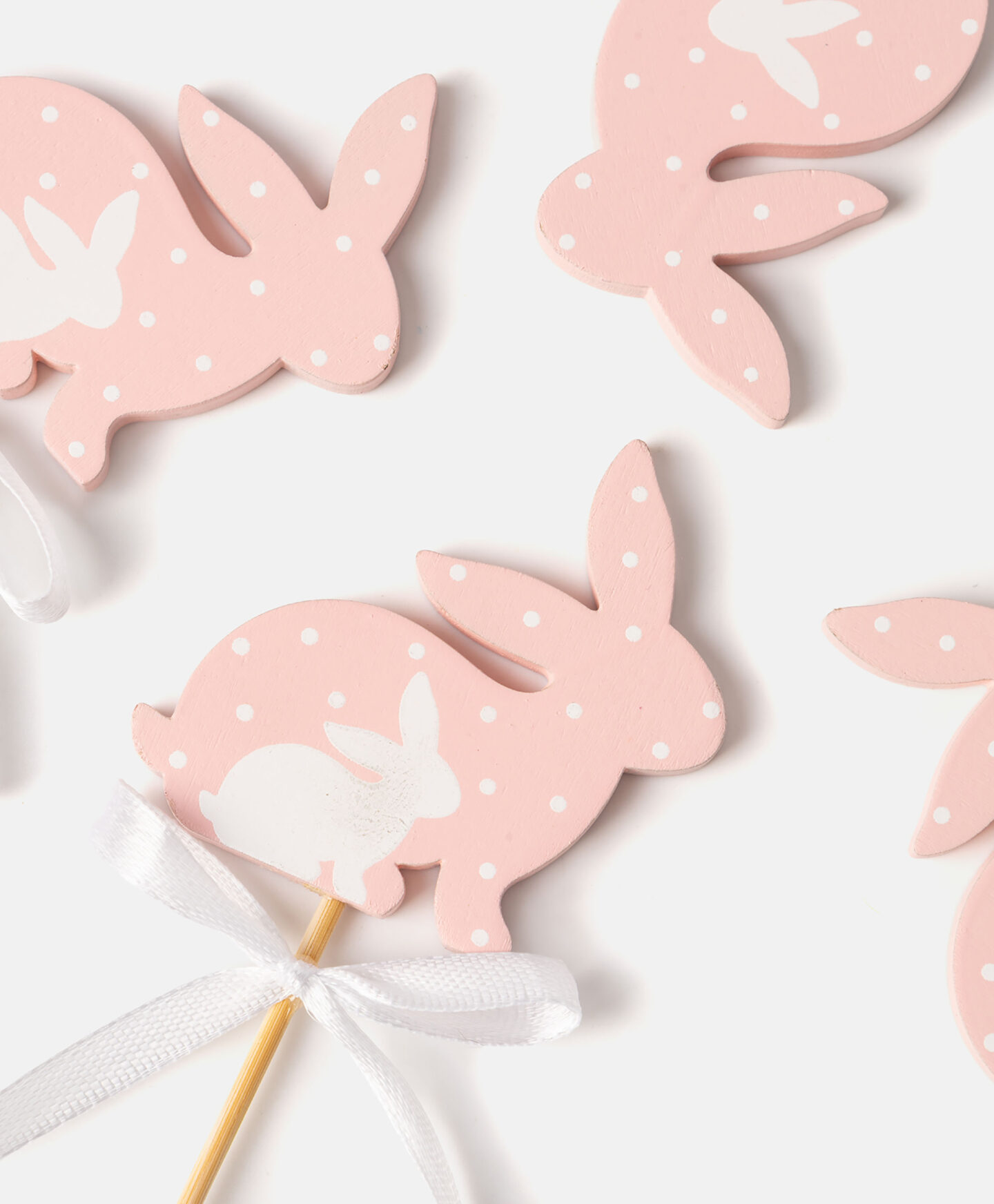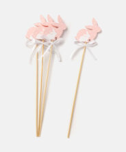 Šis 4 kociņu komplekts ar zaķiem ir elegants dekors, kas radīts, iedvesmojoties no pavasara simboliem. Ideāli piemērots grozu, puķu podu vai pušķu dekorēšanai. Pieejami dažādi dizaini.