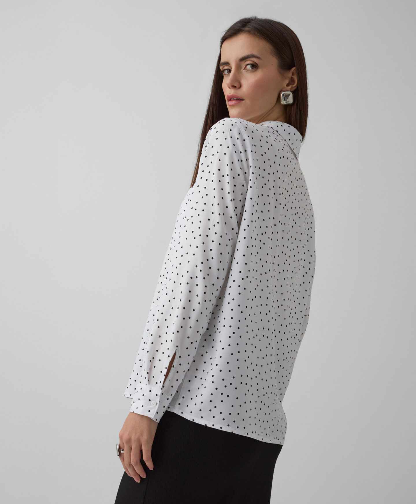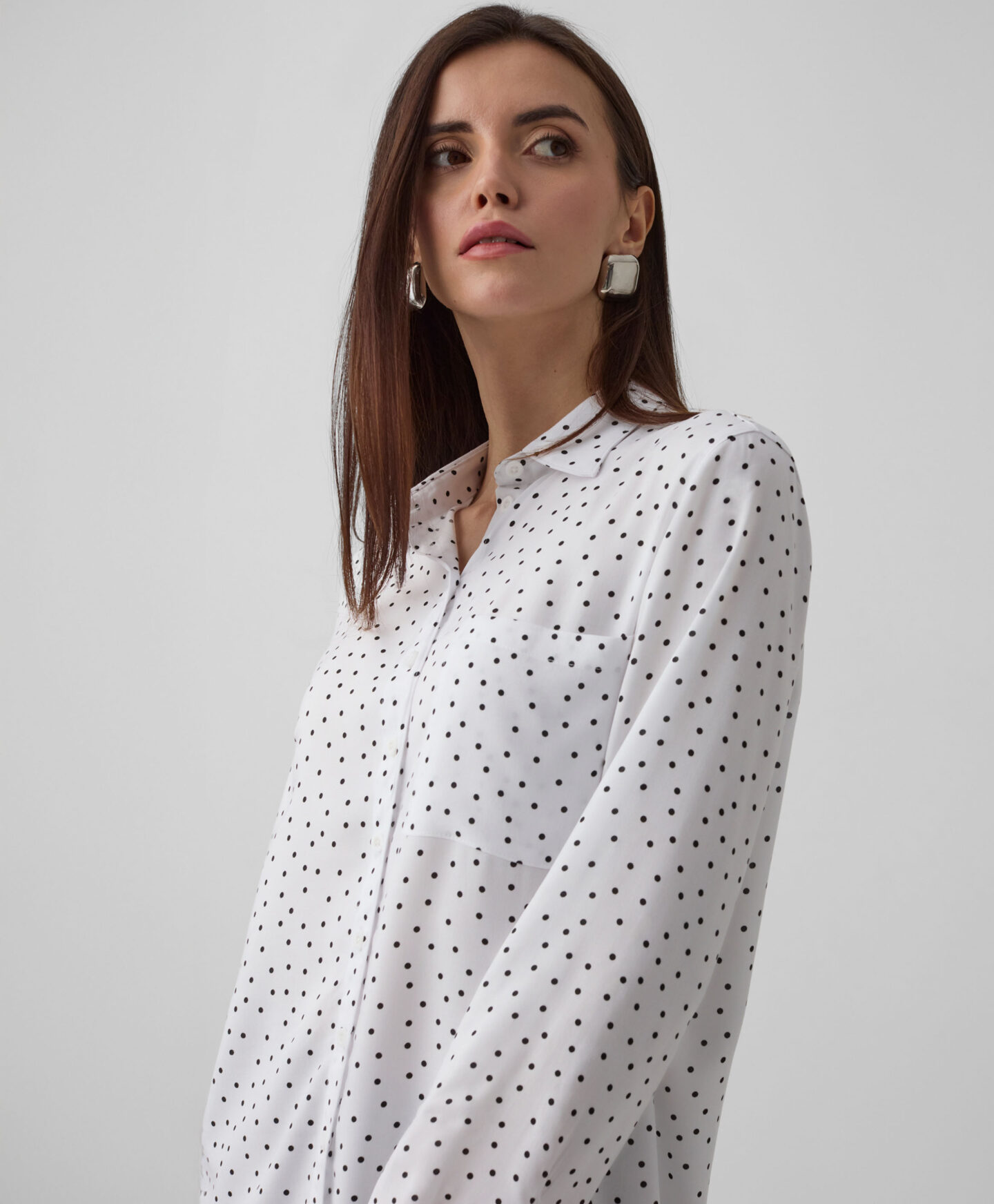 100% viskozes krekls ar punktiņu rakstu pārsteigs ar daudzpusību! Punktiņu raksts nekad neiziet no modes un lieliski izskatās kombinācijā ar jebkuru garderobes elementu – no biksēm līdz svārkiem. Vieglais, elpojošais materiāls nodrošina maksimālu komfortu. Šāds krekls ir kā radīts ofisam, randiņam vai svinīgām ģimenes vakariņām.