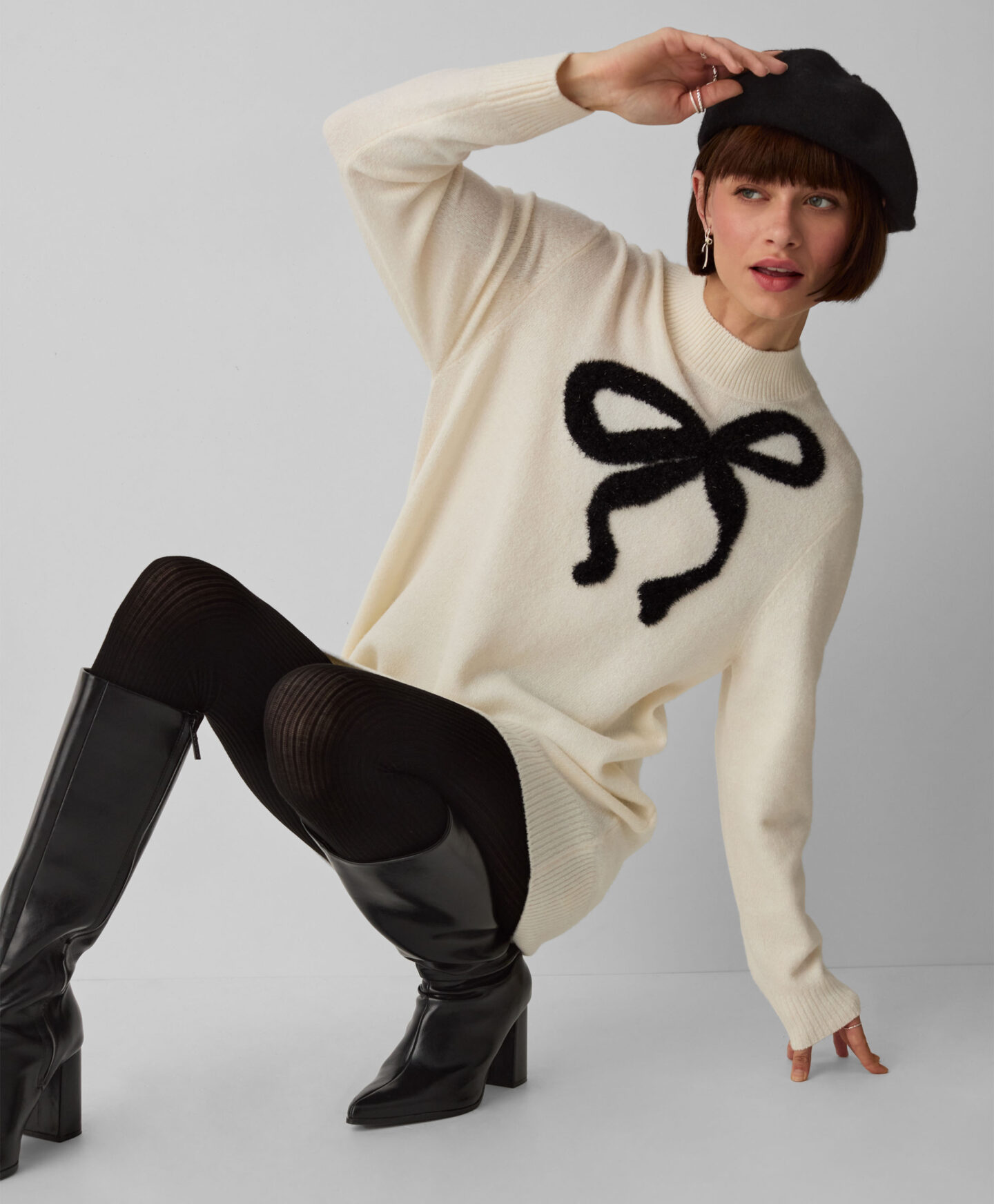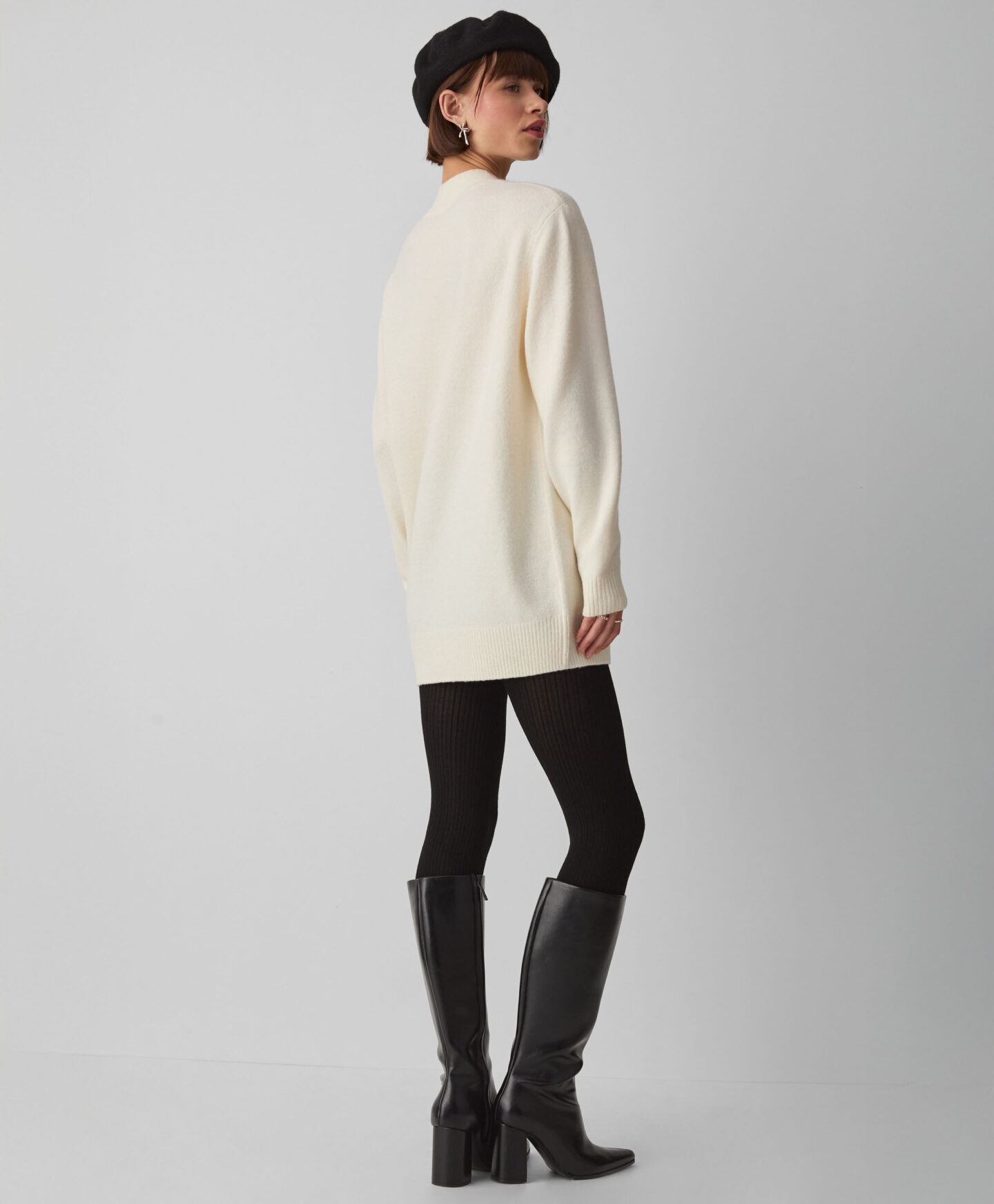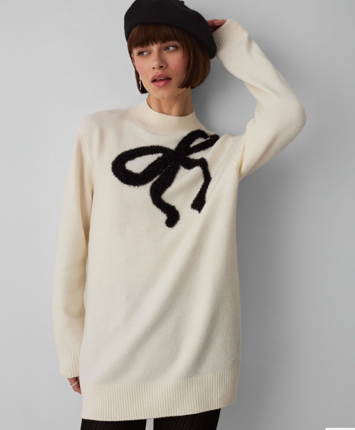 Krēmkrāsas tunika ar banti un lureksu lieliski papildinās rudens garderobi. Tā ir gara, silta un stilīga. Izskatīsies labi kopā ar legingiem vai biezākām zeķubiksēm. Kombinējot ar garajiem zābakiem vai puszābakiem, tā veido apģērbu, kas ir ideāli piemērots pastaigām, darbam birojā vai tikšanās reizēm ar draugiem brīvajā laikā.
