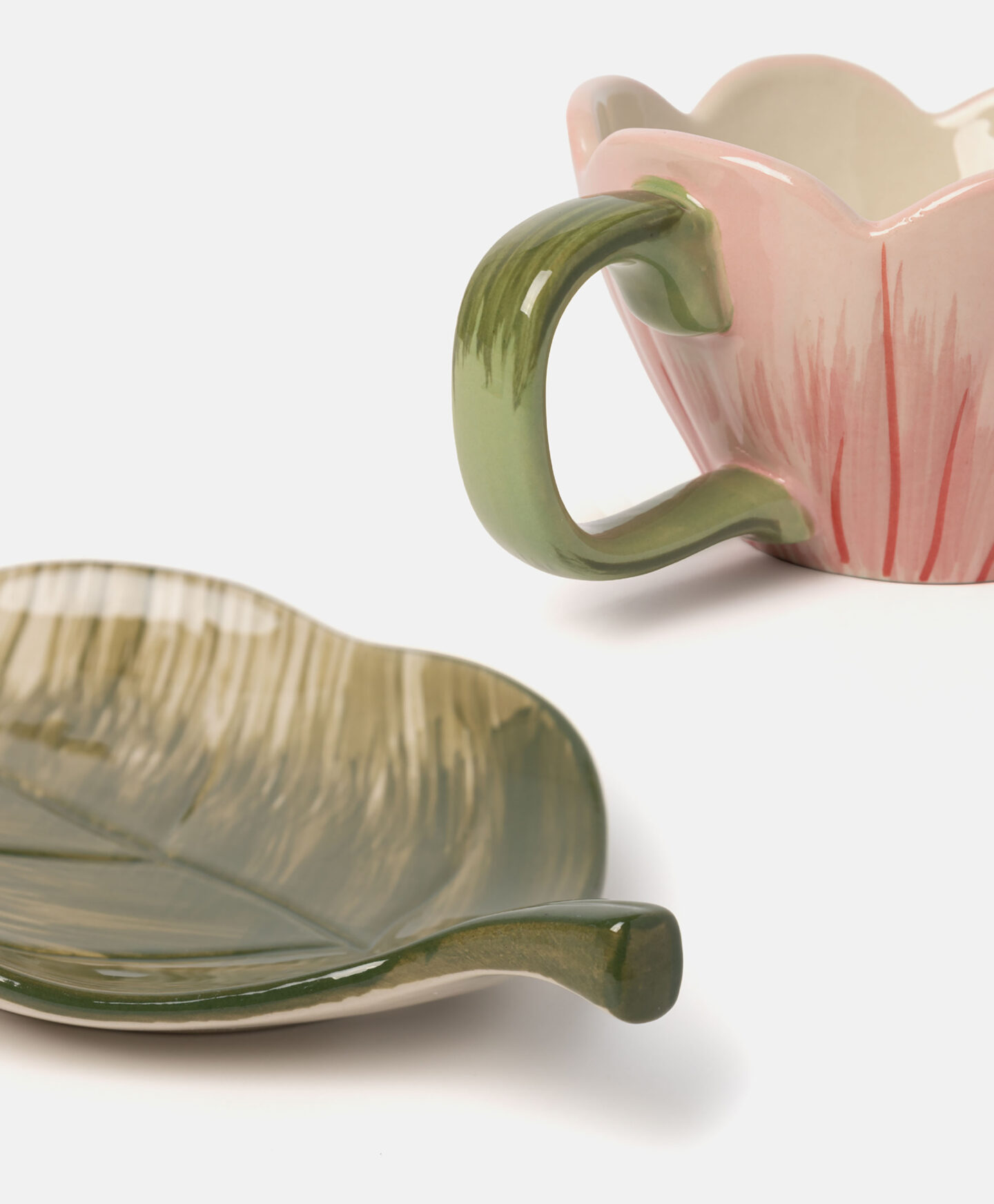 Krūze ar zieda motīvu un lapas formas apakštasīti pārsteidz ar rūpīgi izstrādāto dizainu. Unikālā forma piesaista uzmanību un padara krūzi par labu ideju dāvanai, ko pasniegt kafijas vai tējas cienītājiem. Tā ir ideāli piemērota arī ikdienas lietošanai, piešķirot pasakainu noskaņu katram brīdim ar jūsu iecienītāko dzērienu. Ieaicini pavasari savā virtuvē!