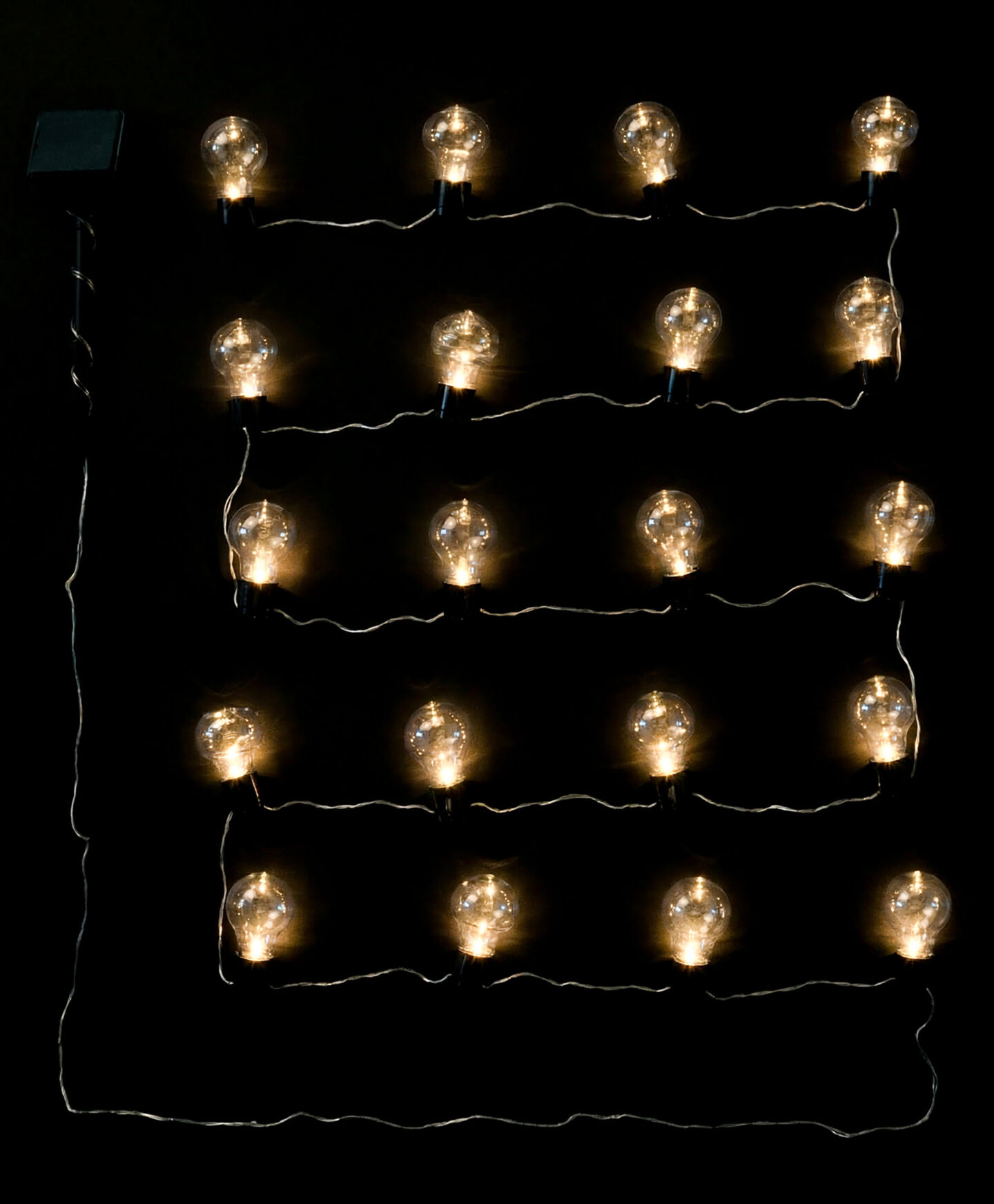 Lampiņu virtene ar saules bateriju un 20 LED spuldzītēm darbojas bez papildu vadiem un baterijām, pateicoties iebūvētajam saules panelim. Tā sastāv no 20 dekoratīvām LED spuldzēm tradicionālā izskatā, radot maģisku, mājīgu gaisotni, kas ir ideāli piemērota vakara pasākumiem. Spuldzes automātiski ieslēdzas krēslas iestāšanās brīdī un izslēdzas rītausmā, nodrošinot apgaismojumu visu nakti bez papildu darbībām.