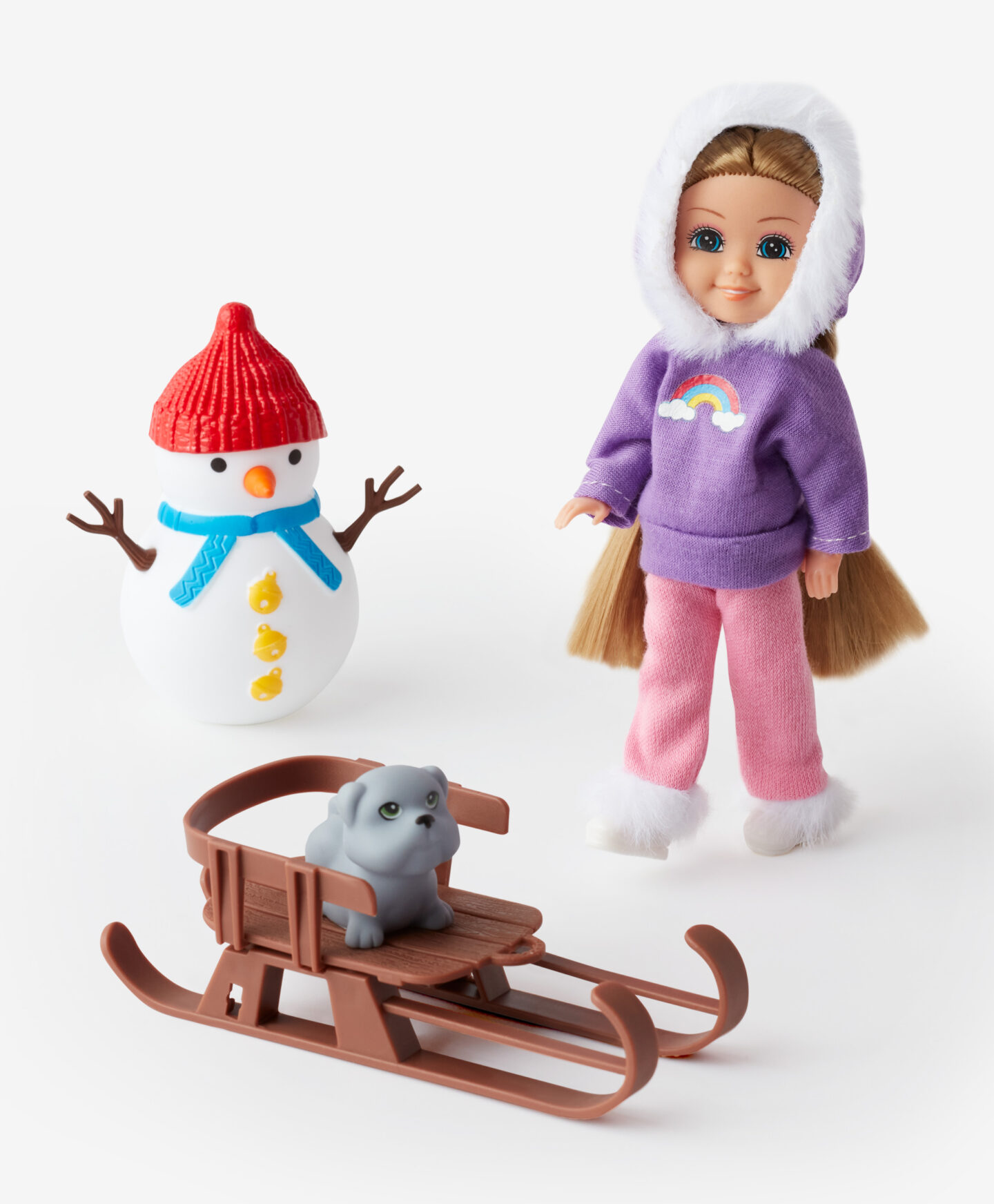 Lelle Nini Love ar ragaviņām iepazīstina bērnus ar ziemas tematikas rotaļu laiku. Siltā sporta kreklā viņa ir gatava sniegainiem piedzīvojumiem. Komplektā ietilpst arī sniegavīrs un papildu elementi, kas uzsver ainas raksturu. Lelle lieliski iederas ziemas stāstu atmosfērā.
