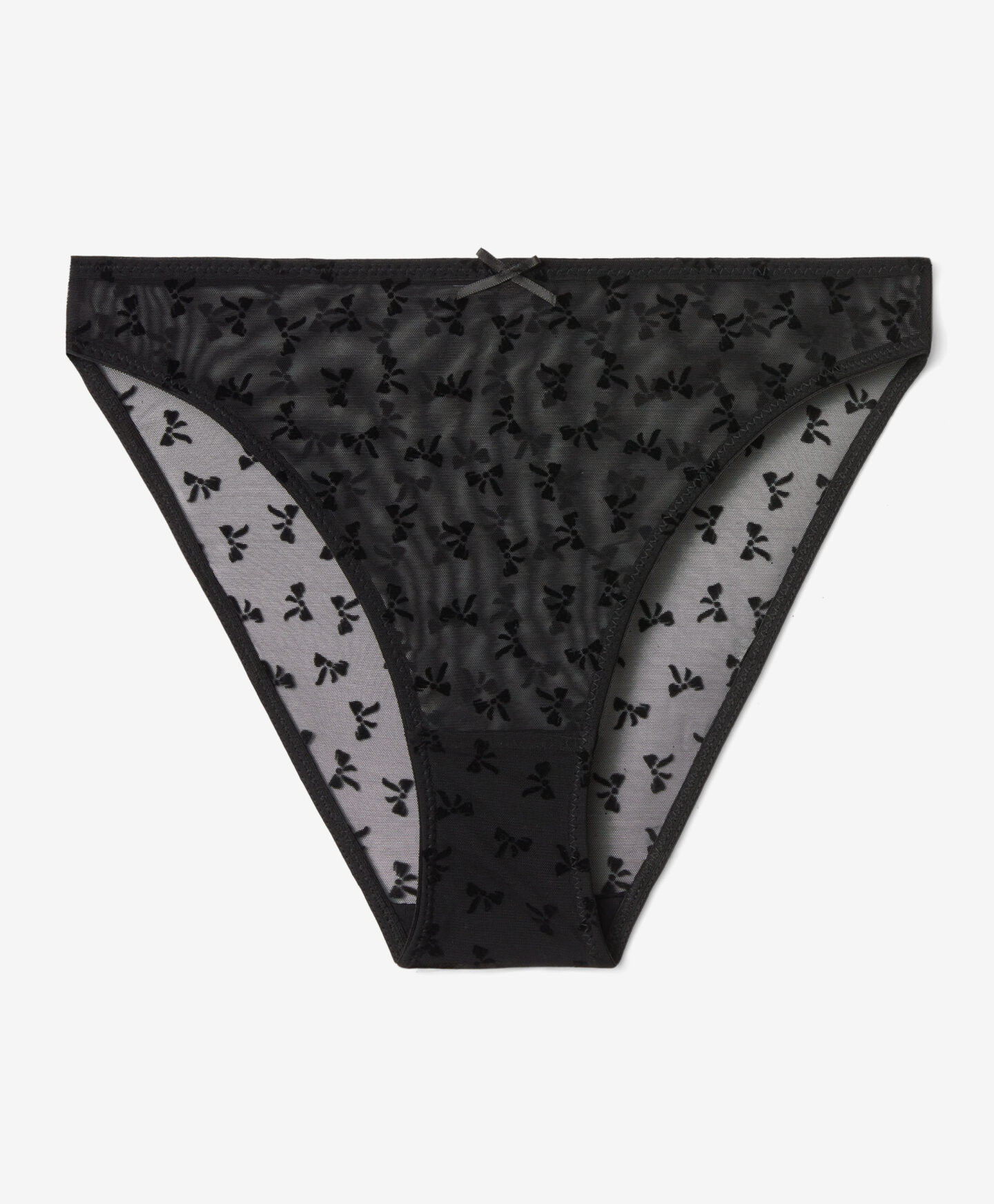 Elegantas melnās biksītes ar sietiņu ir ideāla izvēle klasiskā stila cienītājiem, kam patīk mūsdienīgs dizains. Priekšpusē esošā burvīgā bantīte piešķir vieglu un neuzkrītošu pieskārienu. Elastāna piedeva nodrošina, ka biksītes ideāli pieguļ augumam, akcentējot figūru. Ideāli piemērotas gan ikdienas valkāšanai, gan romantiskiem vakariem. Kolekcijā pieejams arī pieskaņots “balconette” krūšturis.