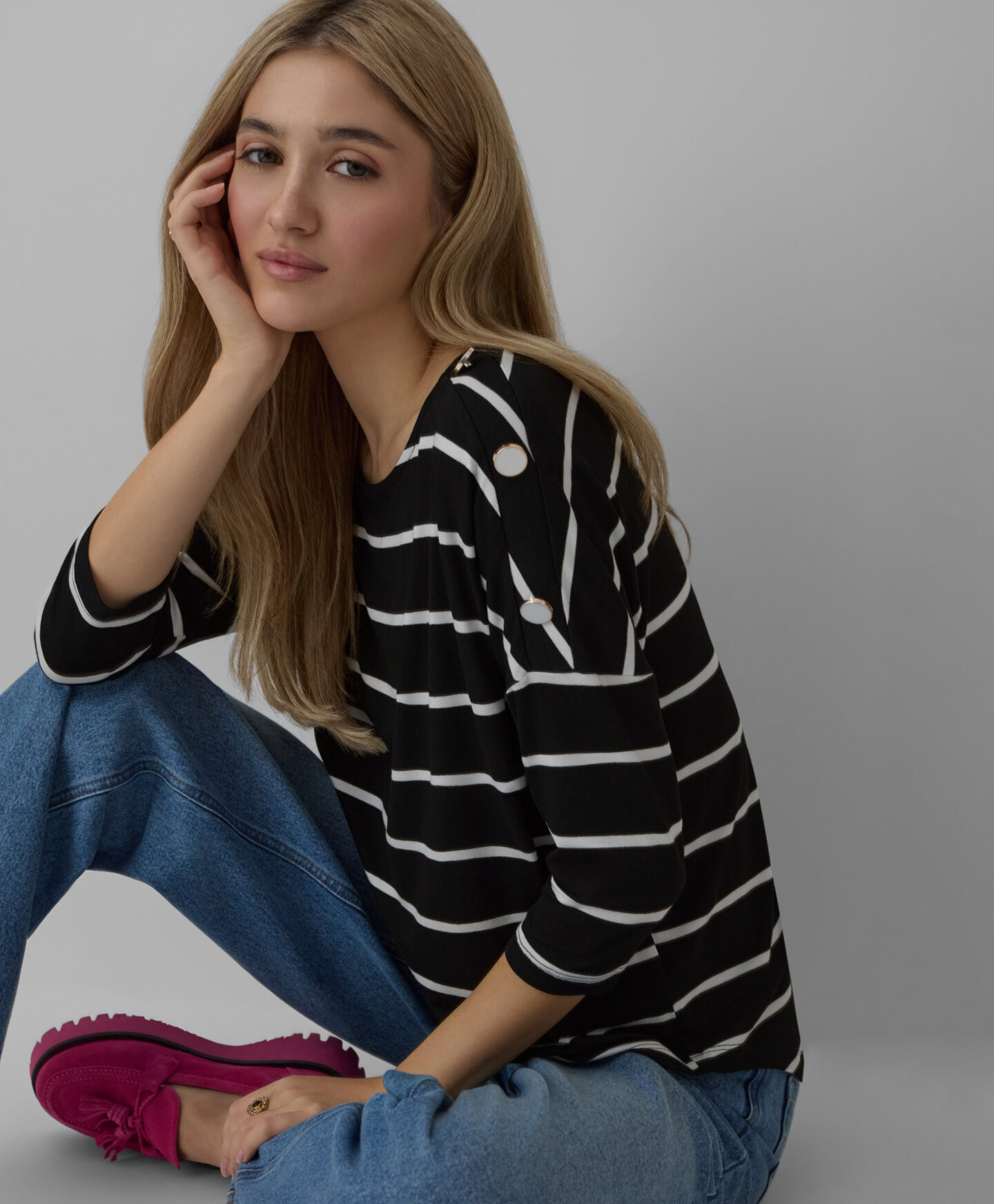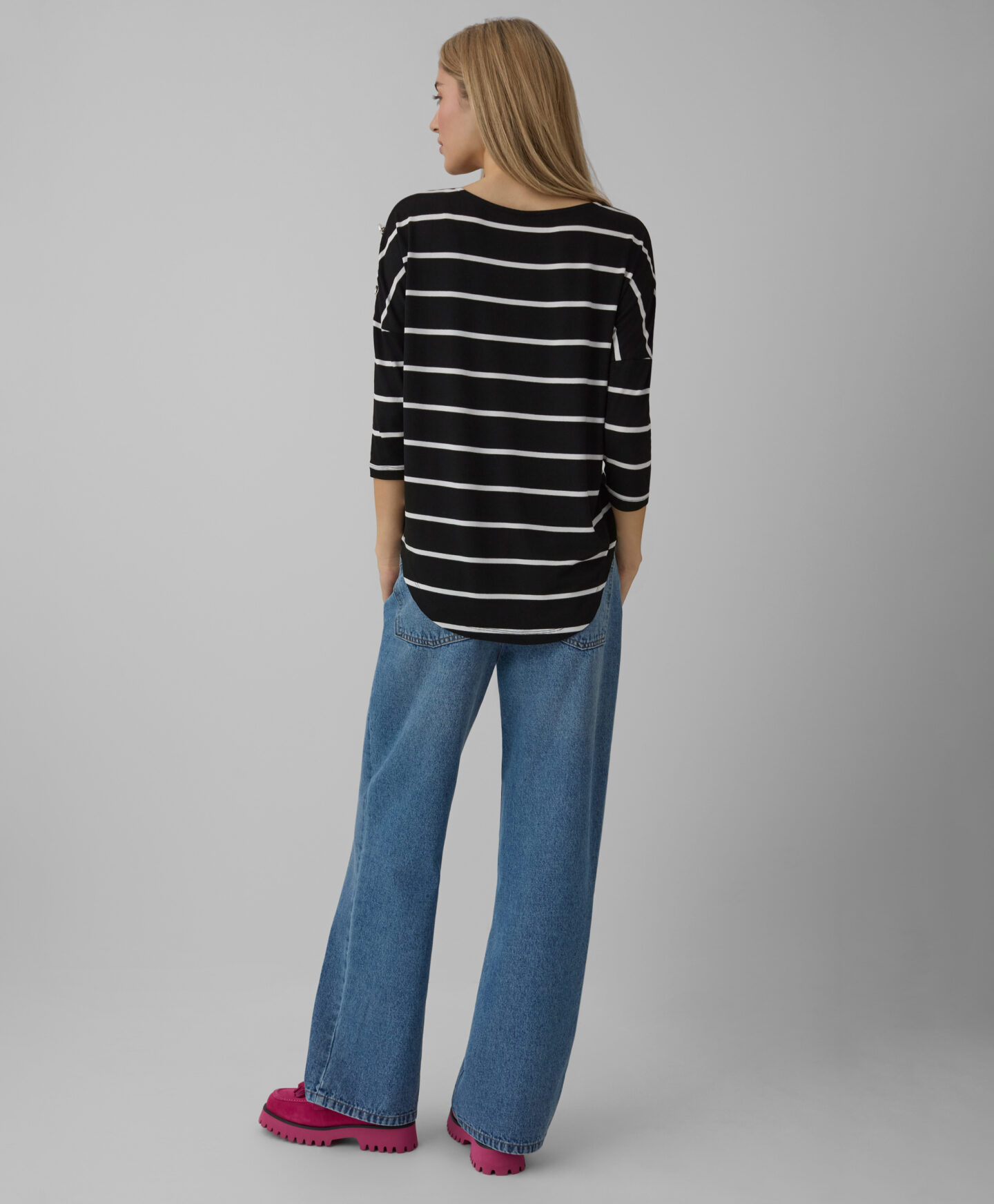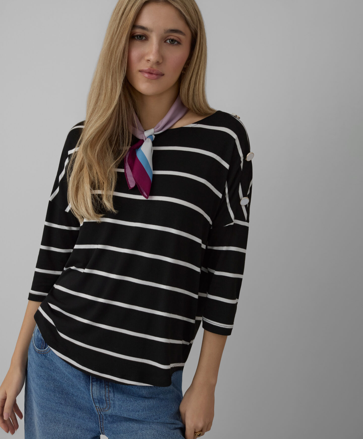 Melns, svītrains T-krekls ar augstu viskozes saturu ir radīts ikvienam, kas novērtē stilu un komfortu. Tā brīvais piegriezums un spilgtā krāsa iederēsies jebkurā garderobē. T-krekls ir ideāla izvēle ikdienas valkāšanai, darbam vai īpašiem notikumiem. Pieejamas divas krāsu versijas.