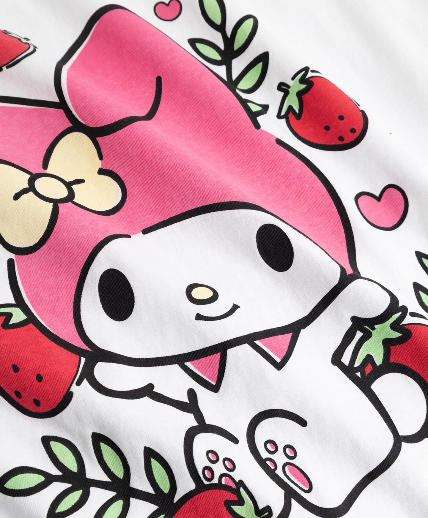 MY MELODY T-krekls, 100% kokvilna, ar īsām piedurknēm ir lieliska ikdienas izvēle. Tas labi iederas gan velkot to kopā ar jaku, gan kā tērpa zvaigzne siltākās dienās. Lielais apdrukas raksts priekšpusē piesaista uzmanību un izceļ T-kreklu. Mīksts, elpojošs materiāls patīkami apņem bērna ādu, rūpējoties par komfortu visas dienas garumā.