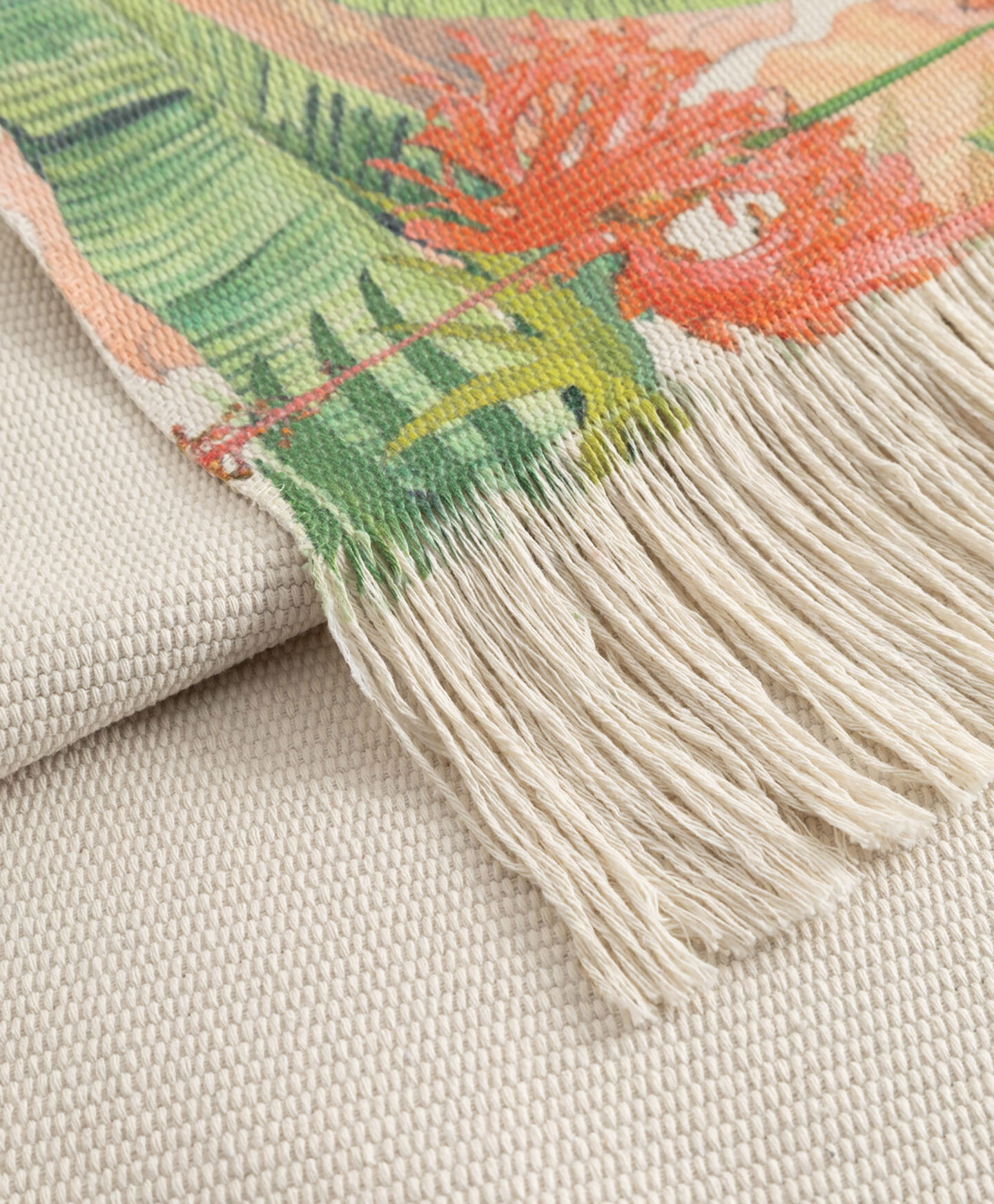 Paklājs ar bārkstīm un hibiska ziedu rakstu piešķirs jūsu interjeram eksotisku šarmu. Krāšņie zaļumi un košās puķes atdzīvinās gan viesistabu, gan priekšnamu. Paklājs lieliski izskatīsies arī guļamistabā vai bērnistabā. Bārkstis tam piešķir vieglumu un savdabīgu šarmu. Tas ir izturīgs, noturīgs pret ikdienas nodilumu un viegli kopjams.