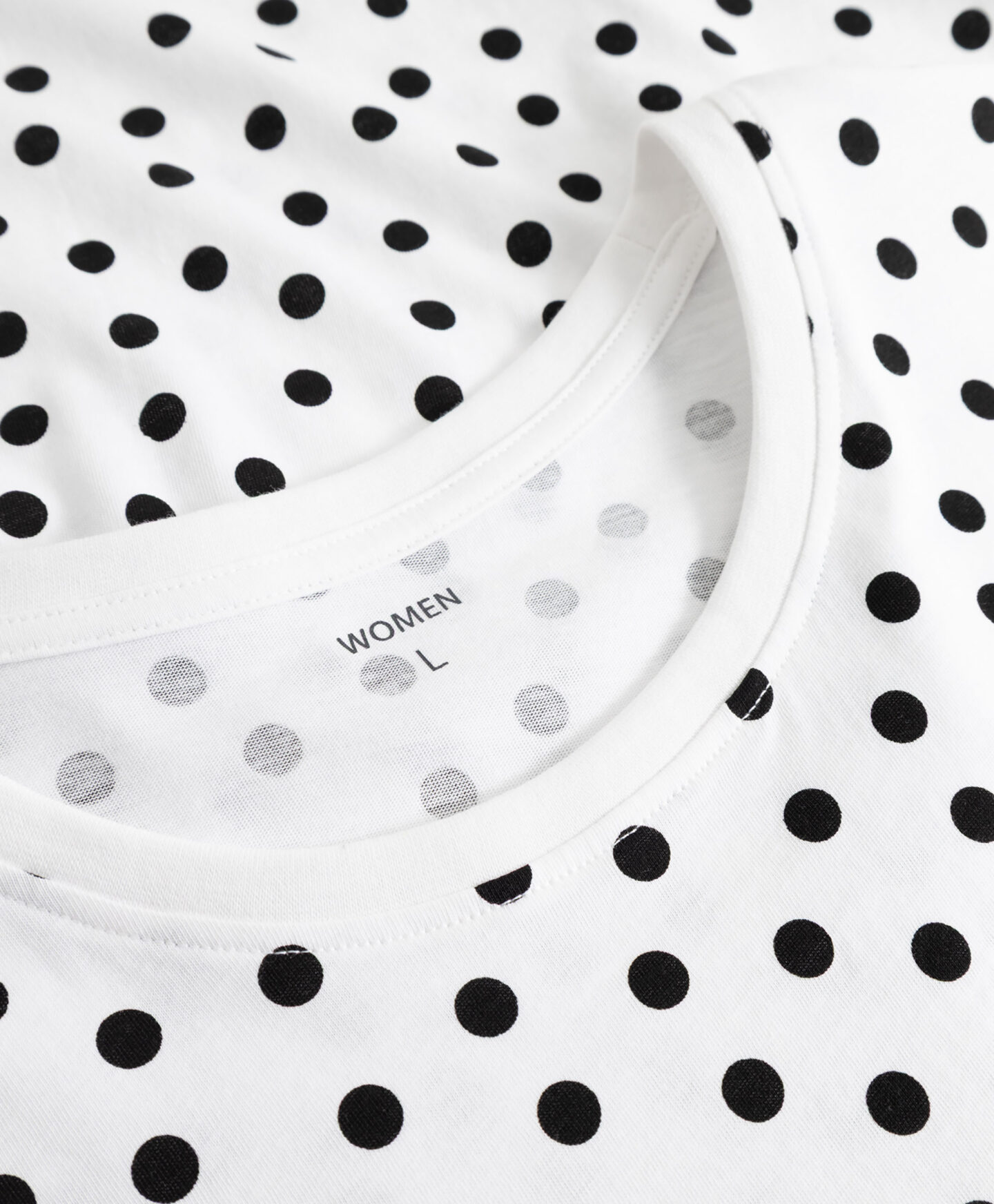 Pieaugušo T-krekls, kas izgatavots no 100% kokvilnas, ar punktiņu rakstu ir piemērots gan darbam ofisā, gan atpūtai mājās. Tas ir viegls un elpojošs. Pateicoties īsajām piedurknēm, tas ir piemērots gan kombinācijai ar jaku, džemperi vai sporta kreklu, gan vilkšanai atsevišķi pirmajās siltajās dienās. Šāds krekls lieliski izskatās kopā ar džinsiem, elegantām vai sporta biksēm. Vienmēr aktuālais punktiņu raksts lieliski papildinās garderobi.