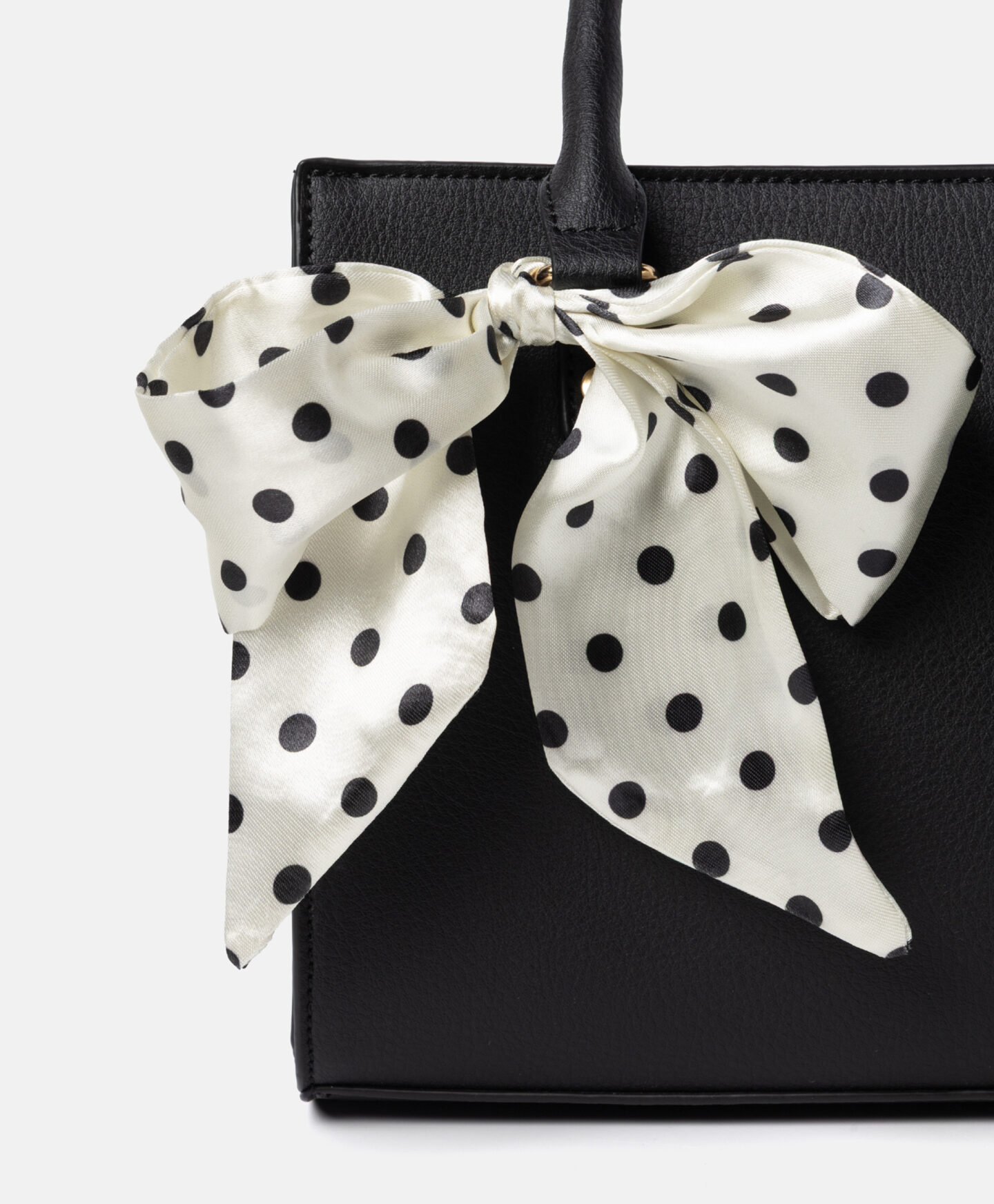 Melna rokassoma ar punktētu šalli ir elegants aksesuārs, kas apvieno klasisko stilu ar modernu pieskārienu. Izgatavota no izturīgiem materiāliem, soma papildina jebkuru tērpu. Dekoratīvā šalle piešķir tai unikālu raksturu.