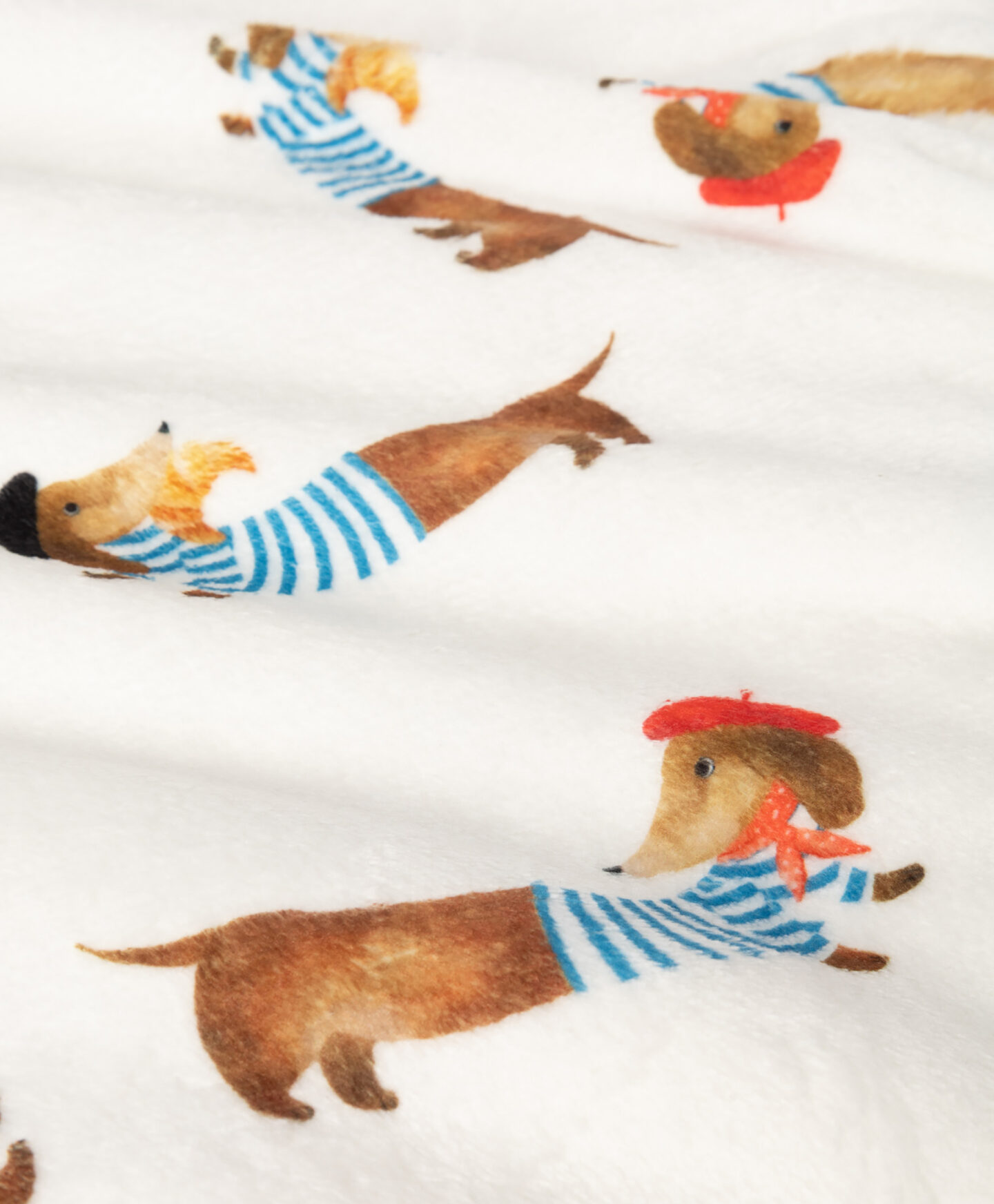 Šī 150 x 200 cm lielā sega ar takšu motīvu ir viegla, silta un mīksta. Tev patiks tajā ietīties garos vakaros, lasot mīļāko grāmatu vai skatoties filmu. Motīvs ar elegantiem suņiem beretēs piešķirs krāsu jūsu kopā pavadītajam laikam!