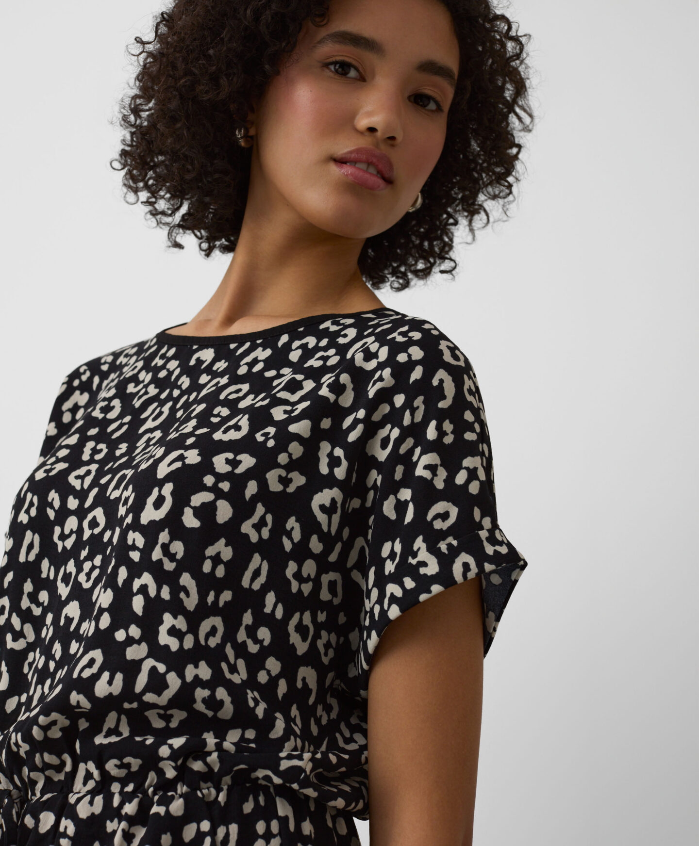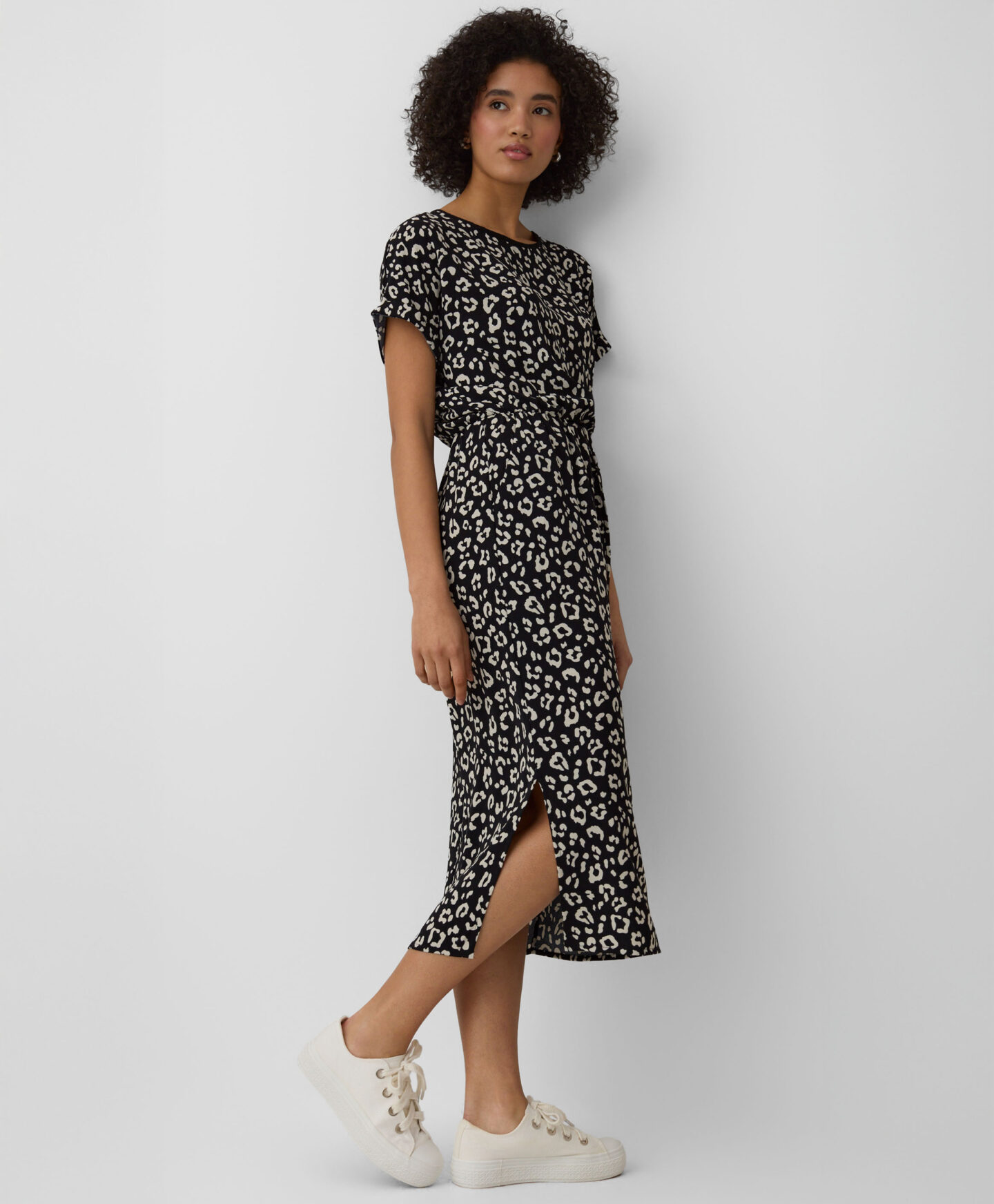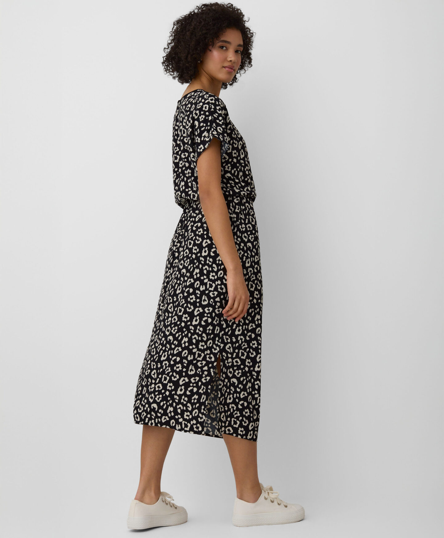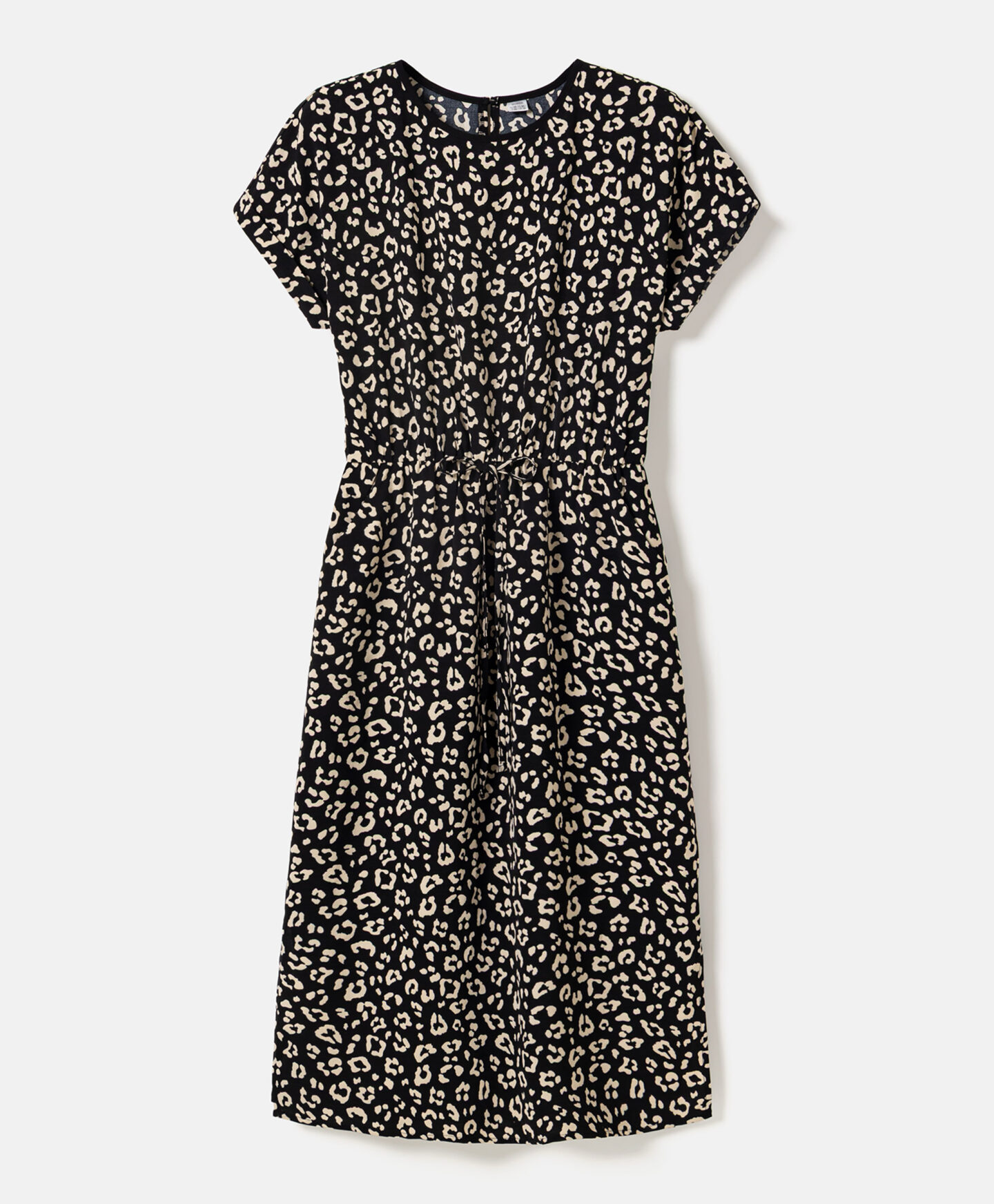 Sukienka damska w cętki wiązana w talii to uniwersalna propozycja z charakterem, idealna na co dzień. Zwierzęcy print wyróżni Cię z tłumu. Sukienka świetnie wygląda w połączeniu z kurtką jeansową lub żakietem.