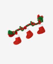 Suņa rotaļlietai, kas ir paredzēta vilkšanai, ir krāsains dizains un mīkstas detaļas sarkanu zeķu formā. Stingrā virve nodrošina izturību, bet plīša elementi dažādo rotaļas un veicina satveršanu. Šāda krāsu gamma rada svētku noskaņu, nodrošinot sunim aizraujošas un kustīgas aktivitātes un jautrību.