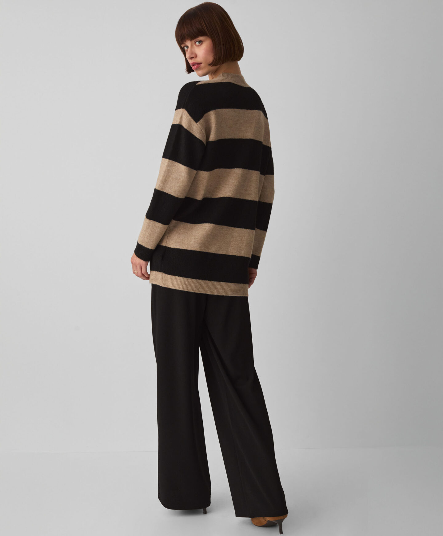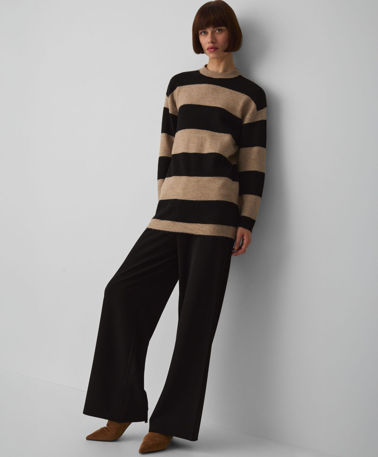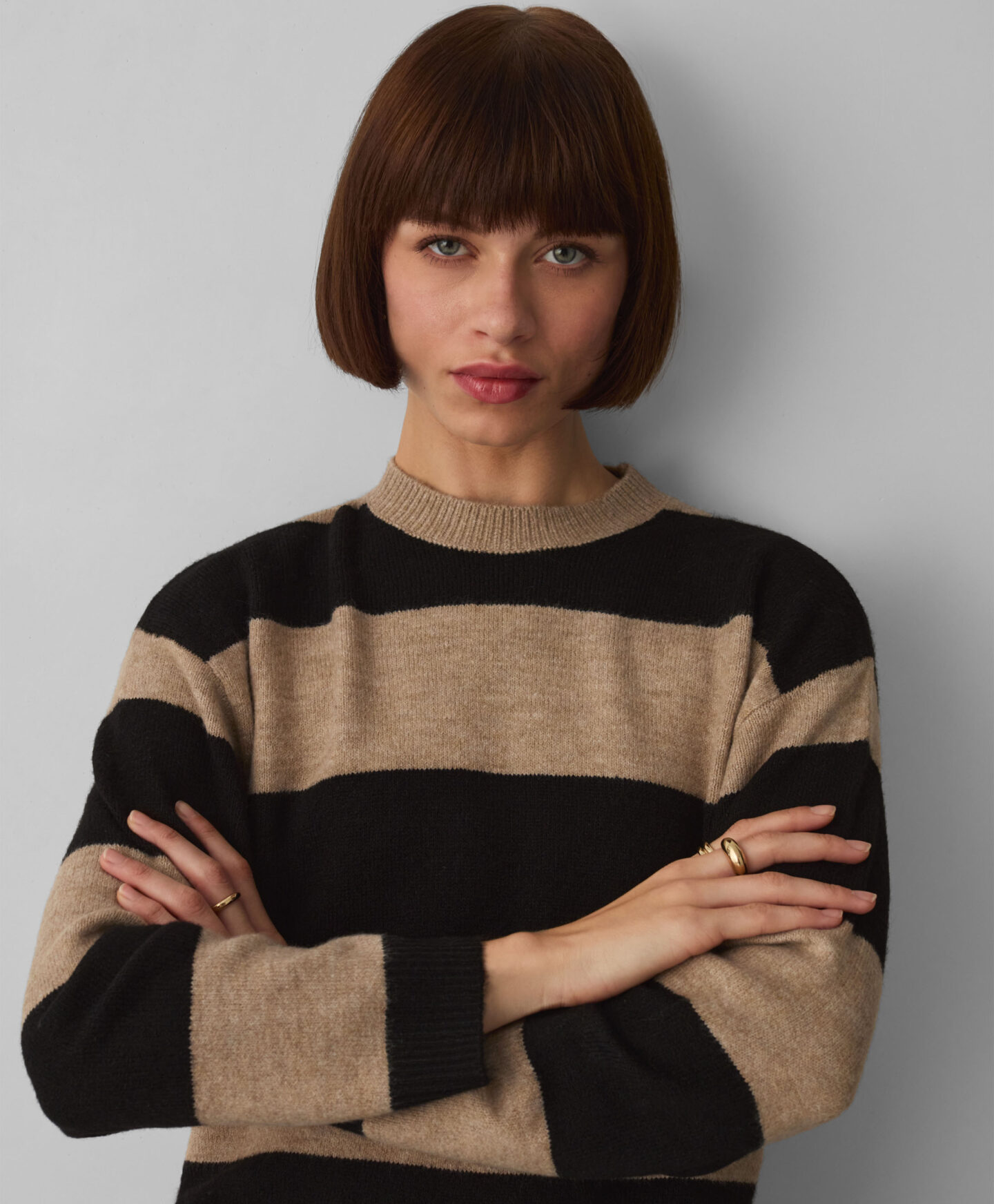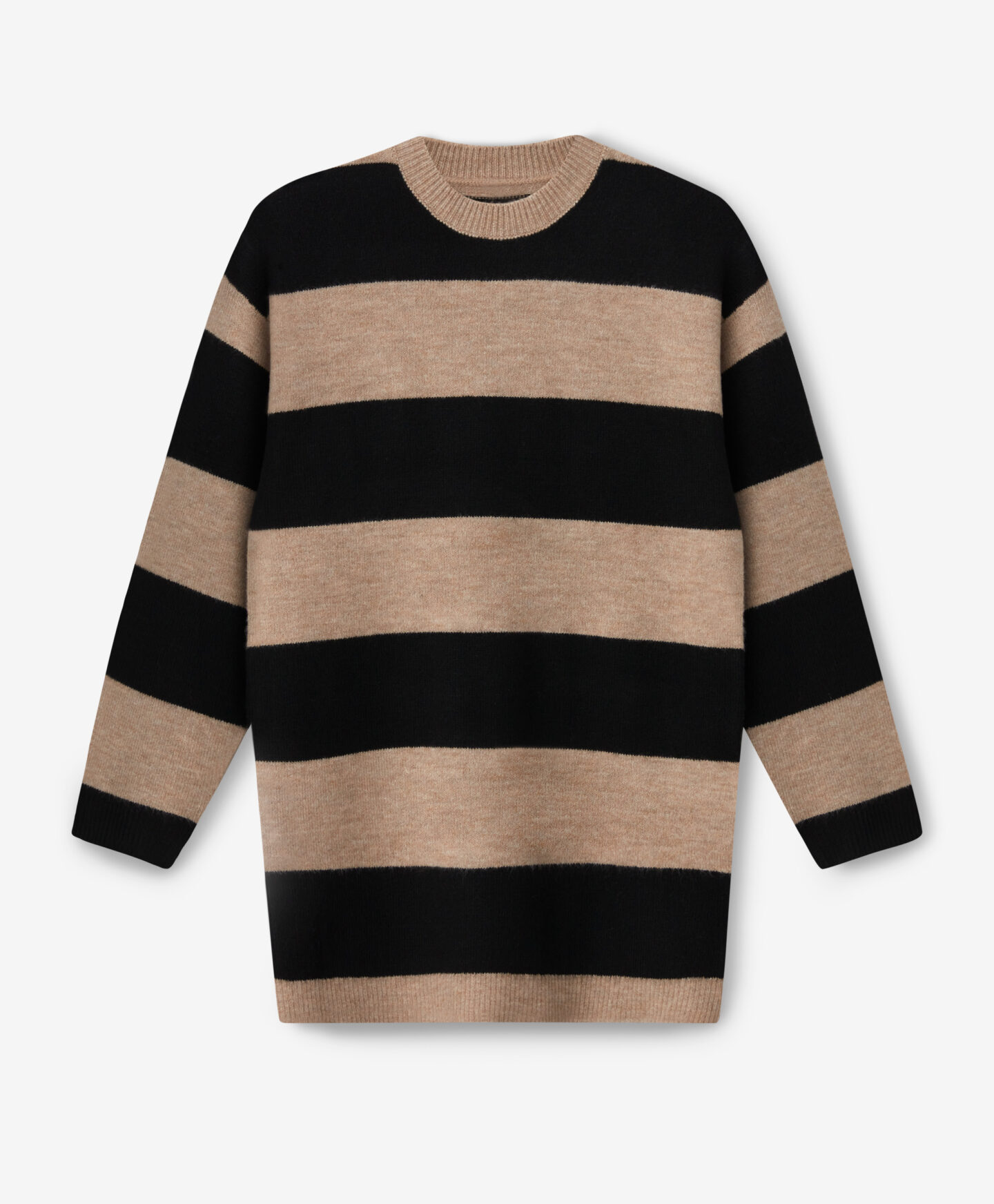Svītraina tunika lieliski papildinās rudens garderobi. Tā ir mīksta, silta un stilīga. Lieliski izskatīsies kopā ar legingiem vai biezākām zeķubiksēm. Kombinējot ar gariem zābakiem vai puszābakiem, tā veido apģērbu, kas ir ideāli piemērots pastaigām, darbam birojā vai tikšanās reizēm ar draugiem brīvajā laikā.